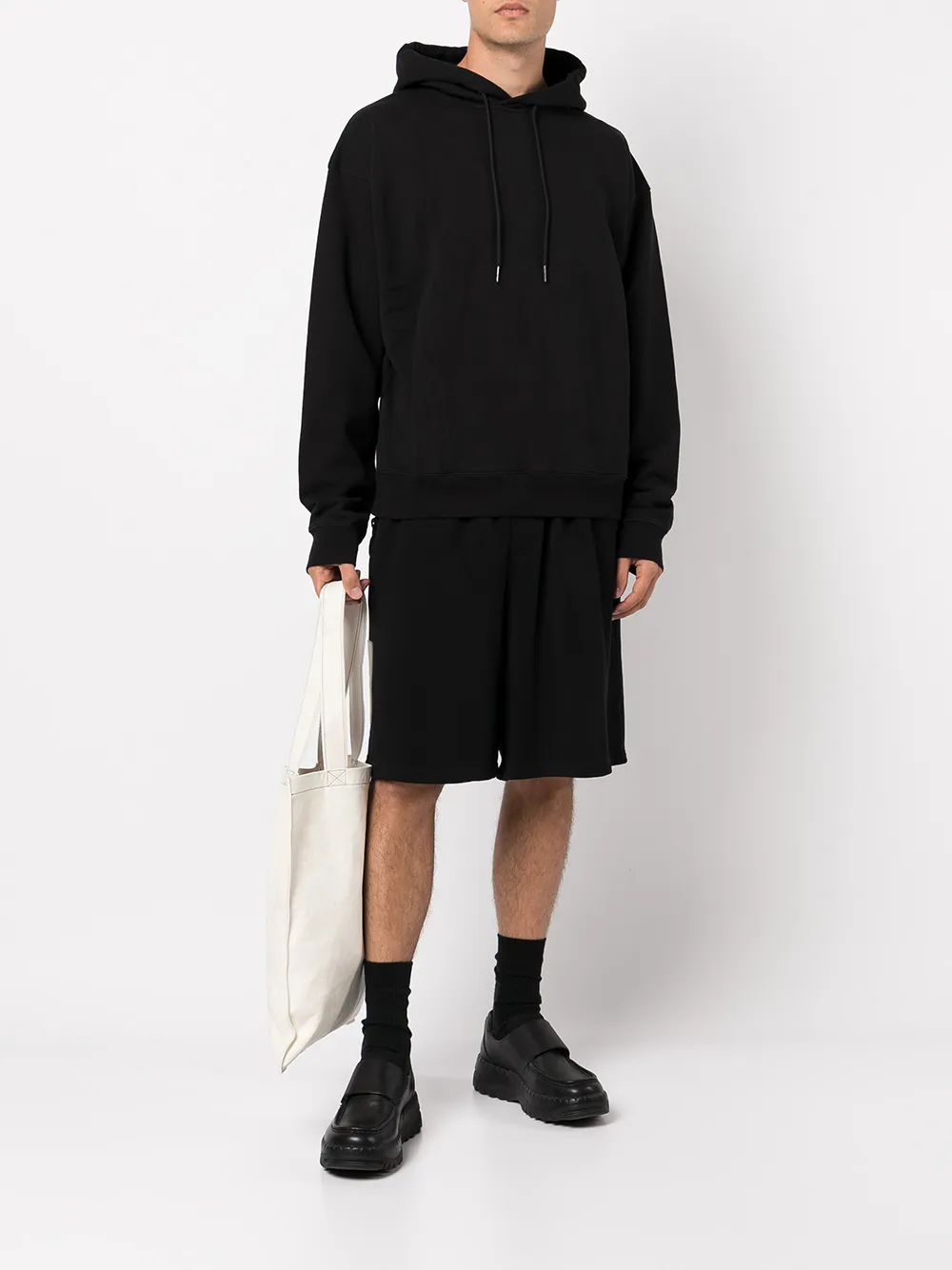 Черный, хлопок, затягивающийся на шнурок капюшон, принт с логотипом сзади, приспущенные плечи, длинные рукава и прямой подол.