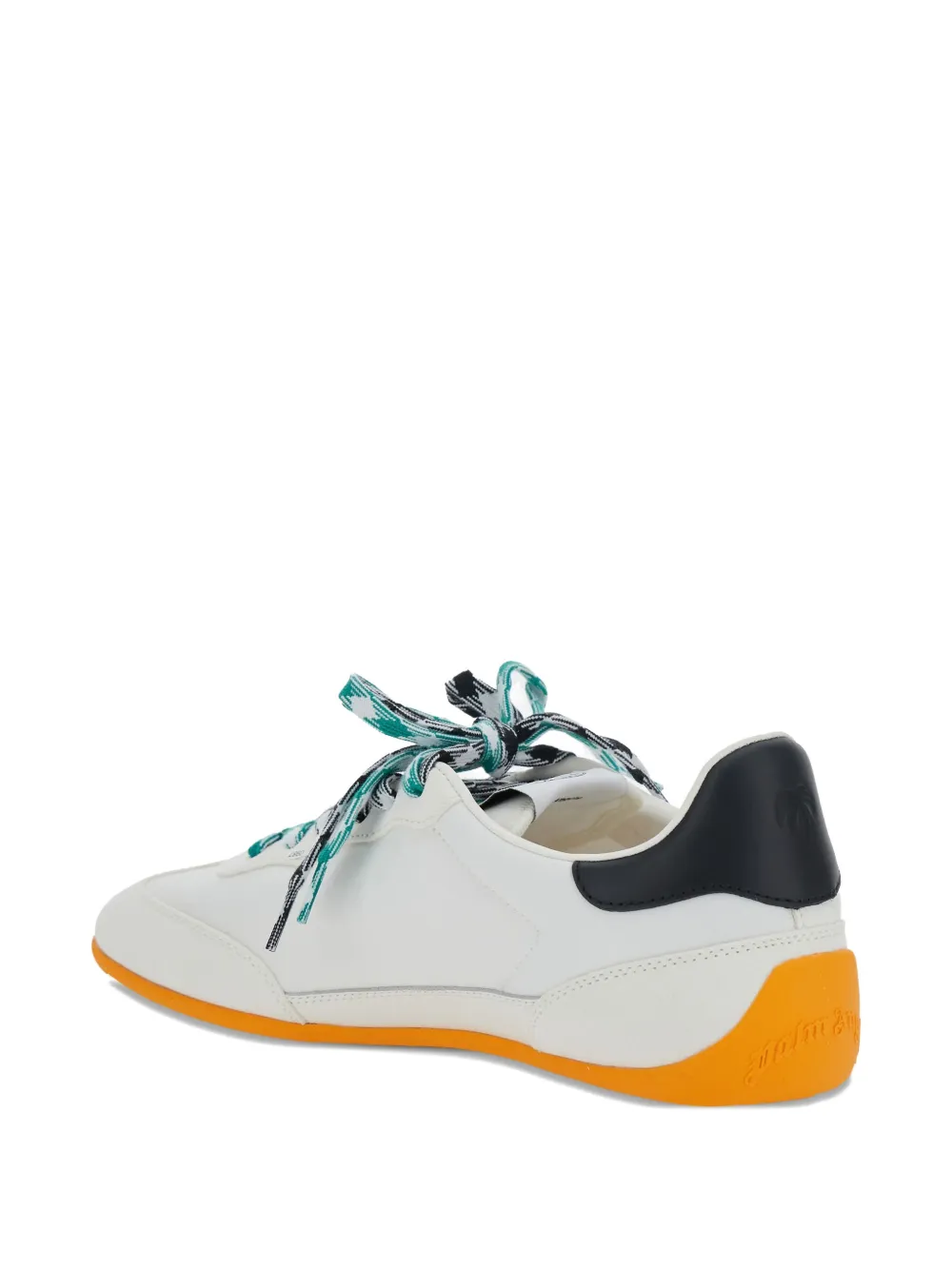Белая пальма с логотипом, оранжевая резиновая подошва, черный каблук, узорчатые шнурки, кожаный верх.