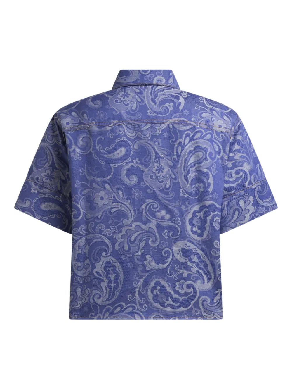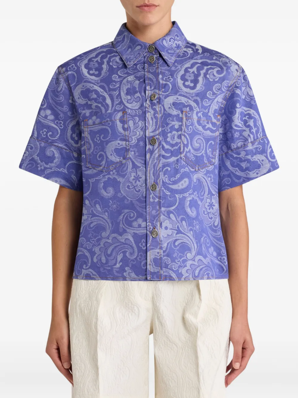 Синий узор пейсли, короткие рукава, застежка на пуговицы, накладные карманы, джинсовая текстура.