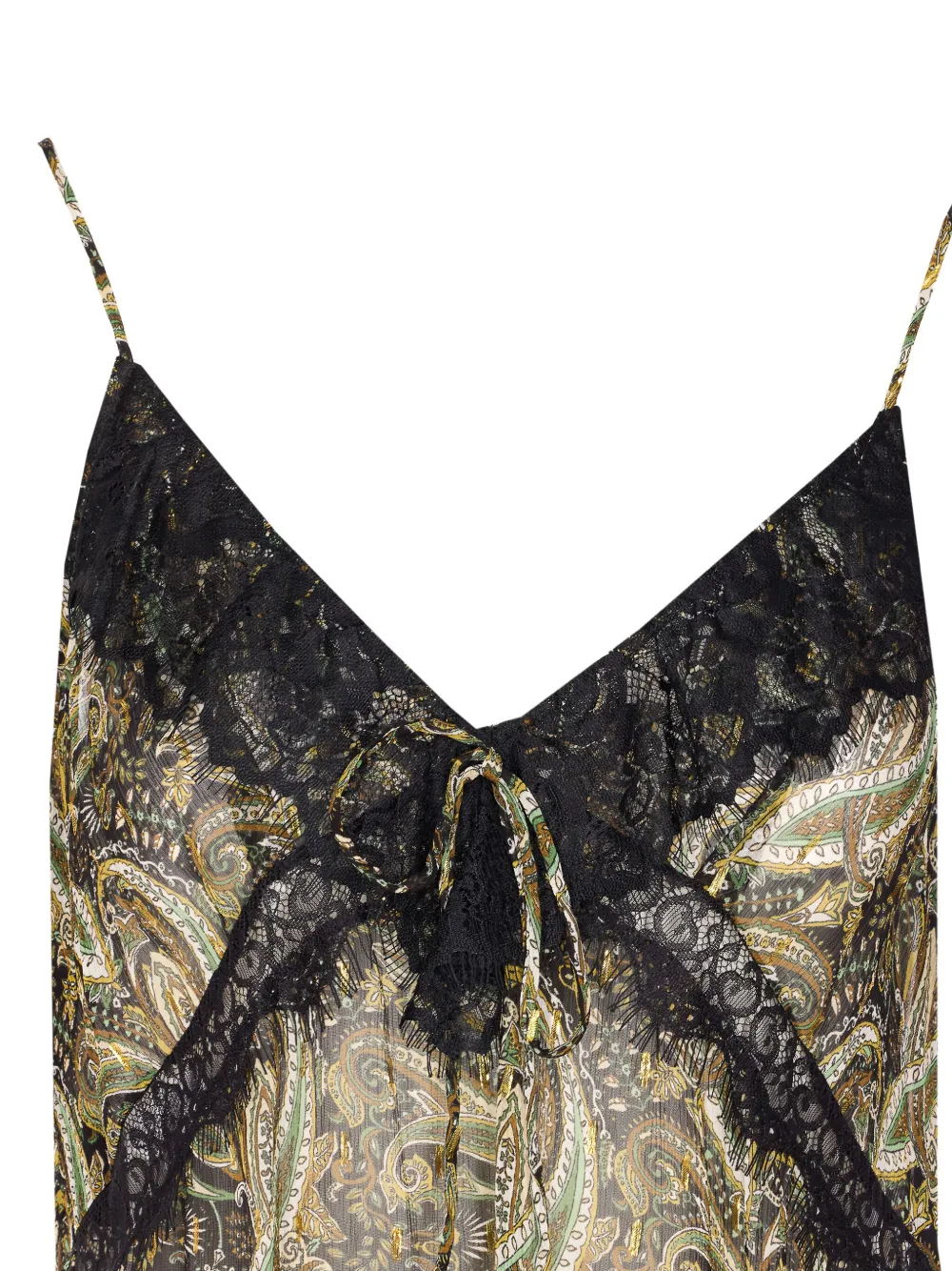 Зеленый узор пейсли, V-образный вырез, тонкие бретели, кружевная отделка