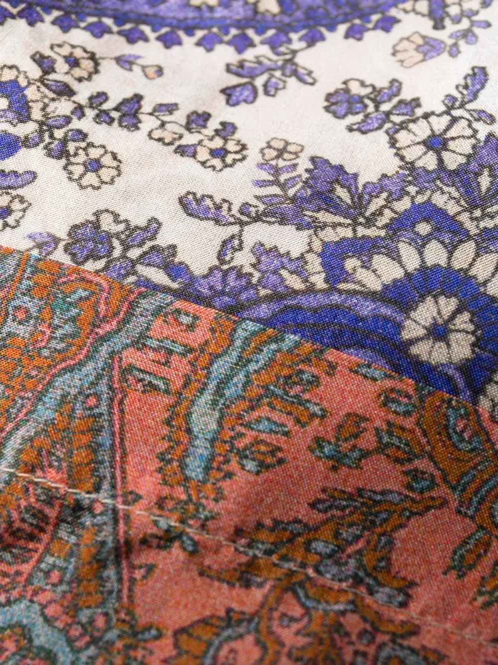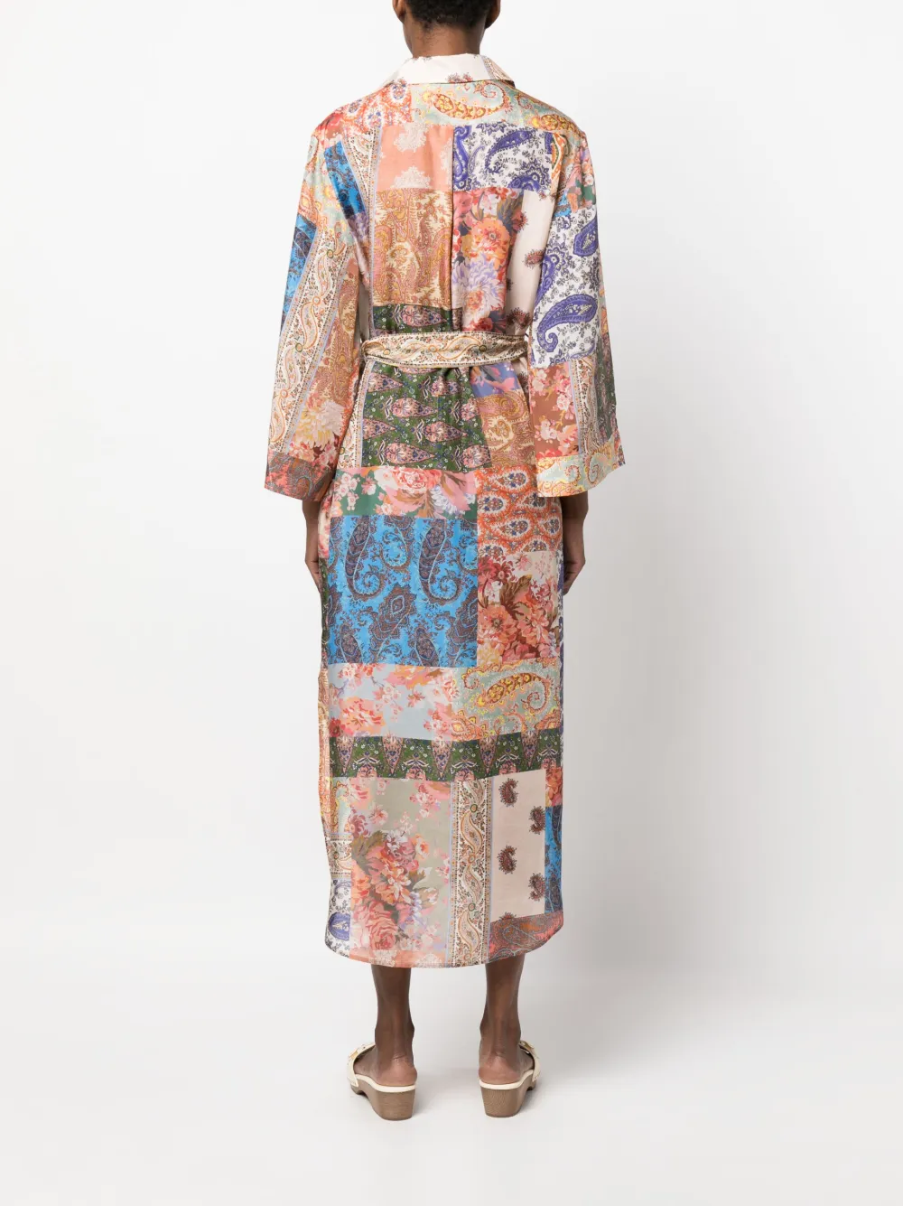 Разноцветный, шелк, принт пейсли, смешанный принт, классический воротник, планка на пуговицах спереди, кулиска на талии, рукава три четверти и длина миди.