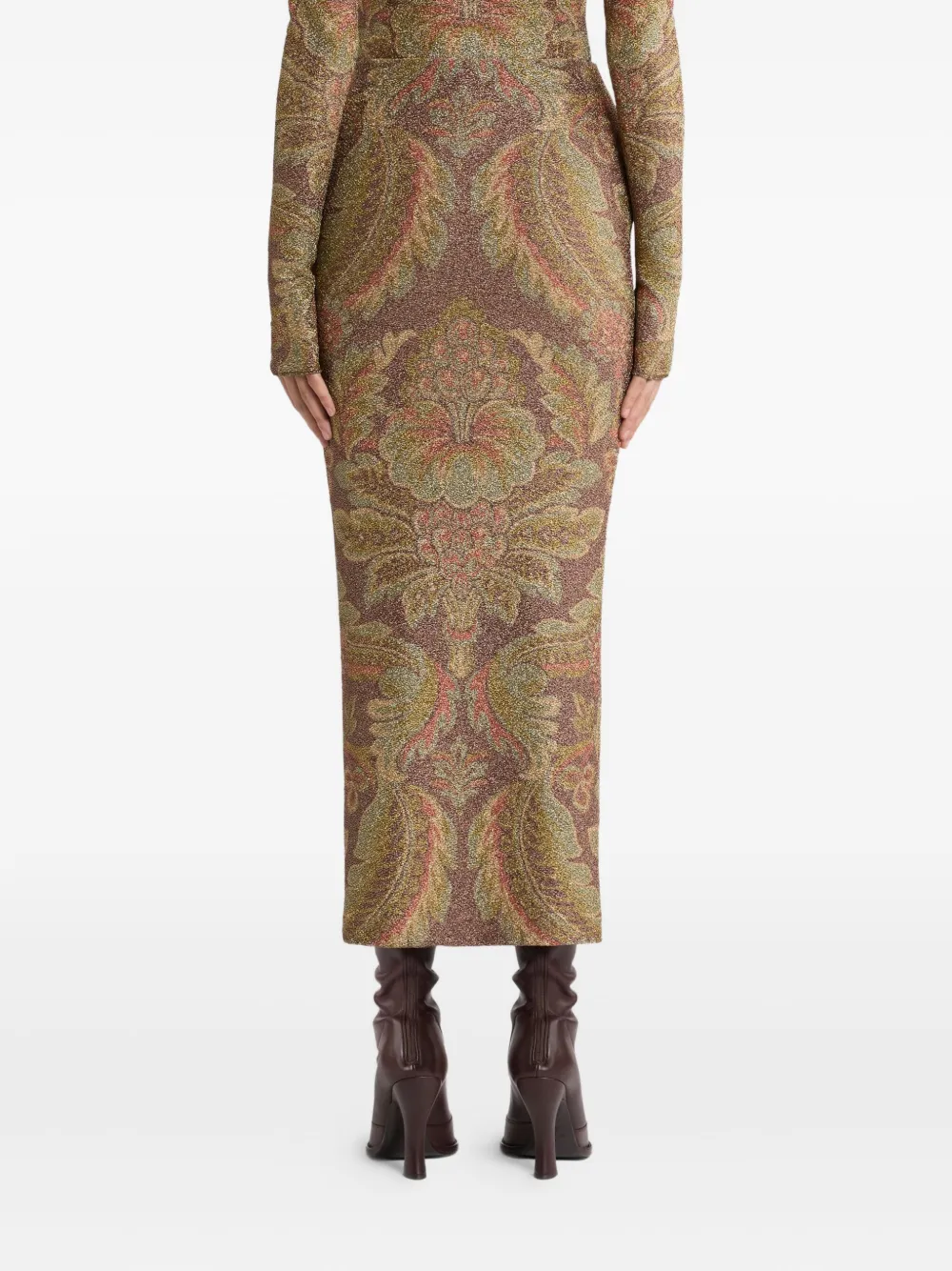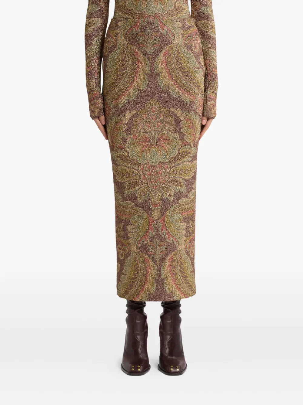 Коричневый трикотаж с металлическими вкраплениями и узором пейсли, длина миди, высокая талия