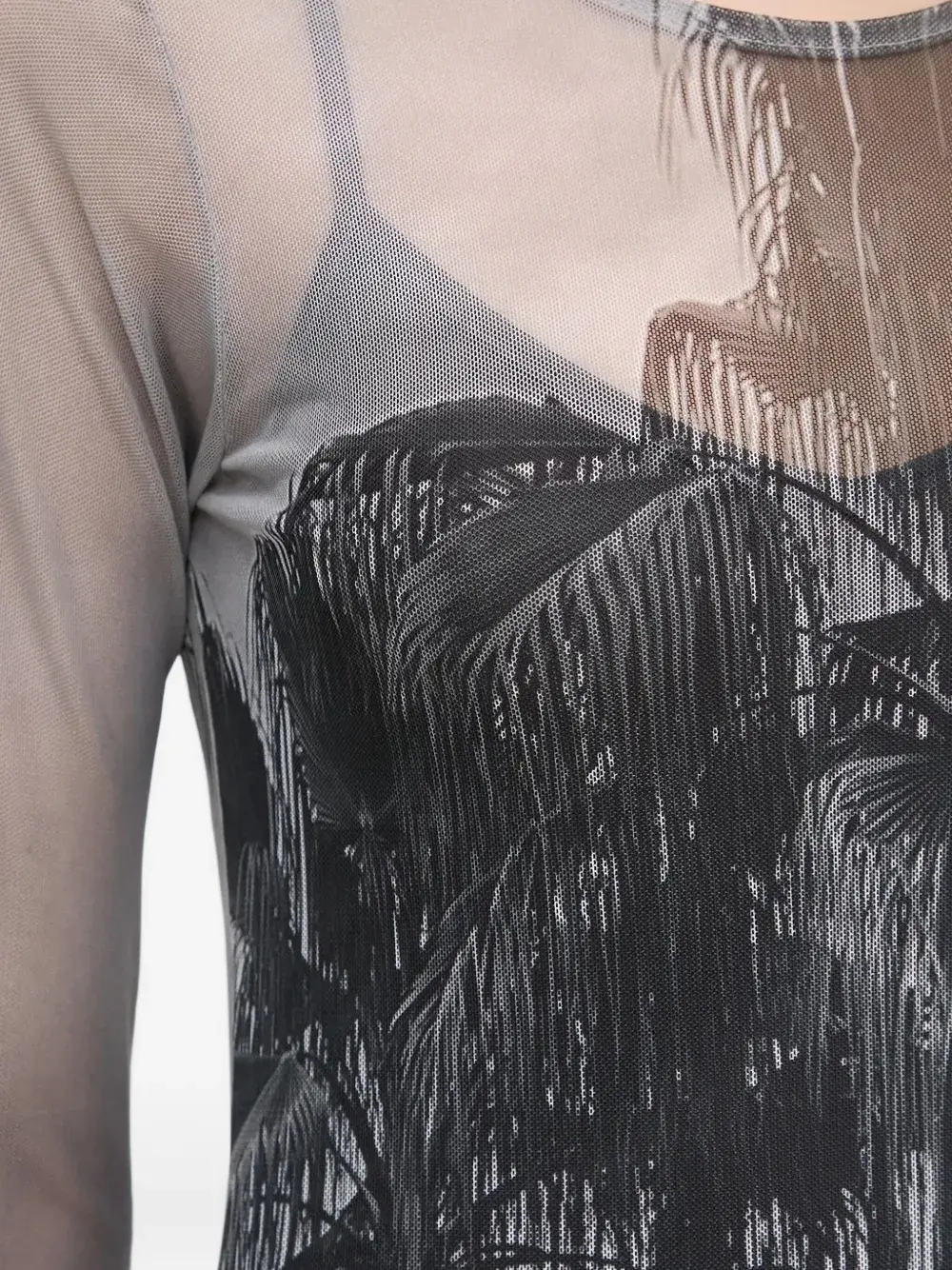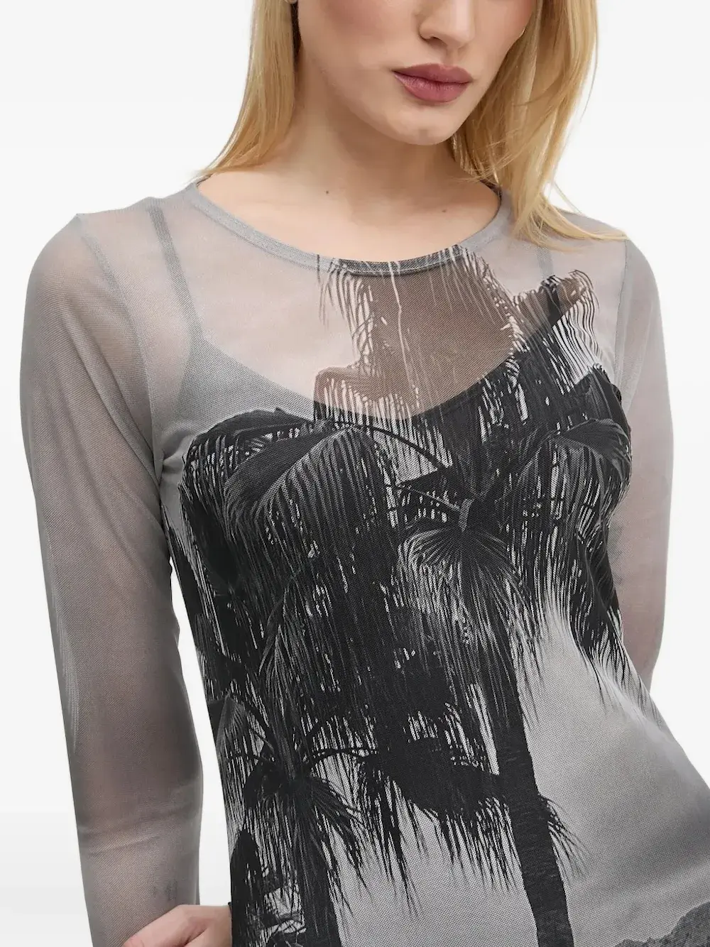Черная кофточка с длинными рукавами и круглым вырезом, с принтом пальм.