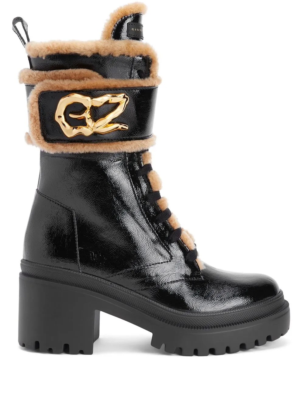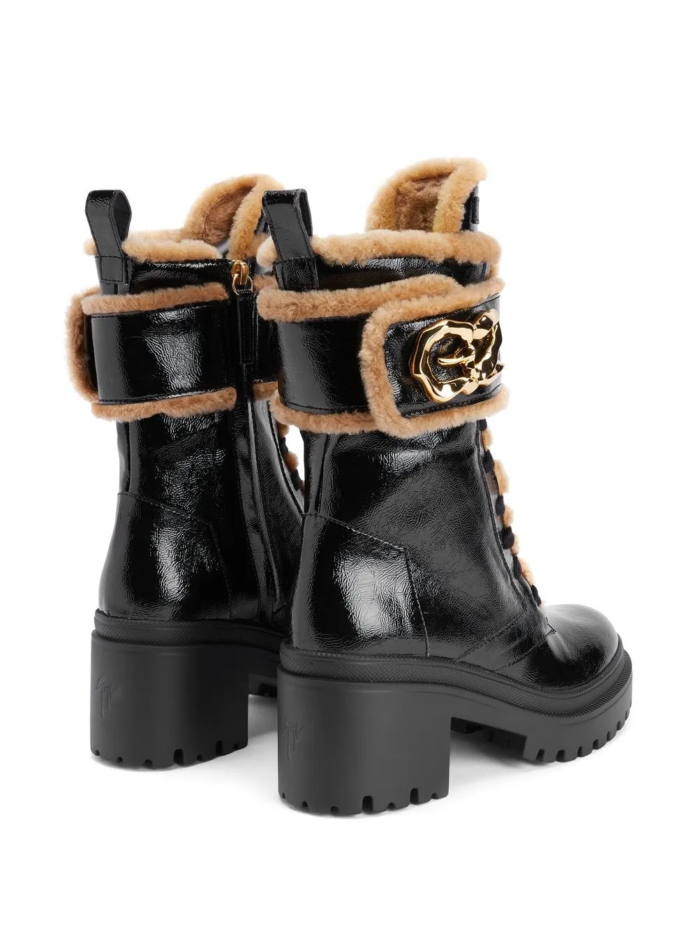 Черный, коричневый, жатый эффект, отделка из искусственной овчины, золотистый металлический логотип, нашивка с логотипом на язычке, тисненый логотип сзади, двойная петля для подтягивания, закругленный носок, высота по щиколотку, шнуровка спереди, застежки на молнии сбоку, блочный каблук средней высоты и рифленая резиновая подошва.