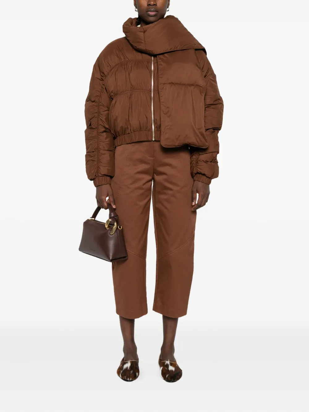 Модель коричневого цвета в форме шара с высокой талией, панельным дизайном, двумя диагональными карманами и застежкой на пуговицы спереди.