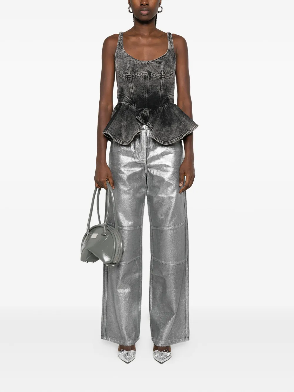 Серебристый металлик с заниженной талией, вставками, прямой крой, пять карманов