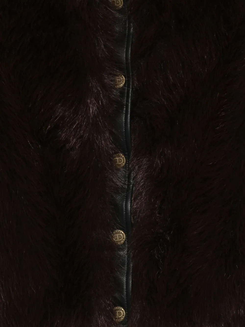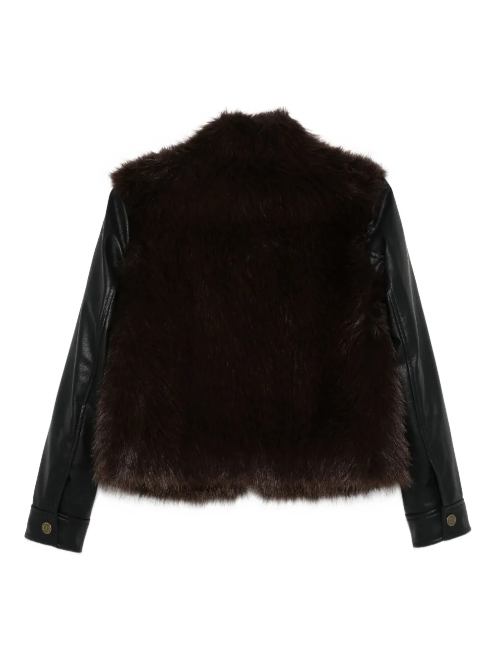 Черный искусственный мех, рукава с имитацией кожи, застежка на пуговицы, укороченная длина