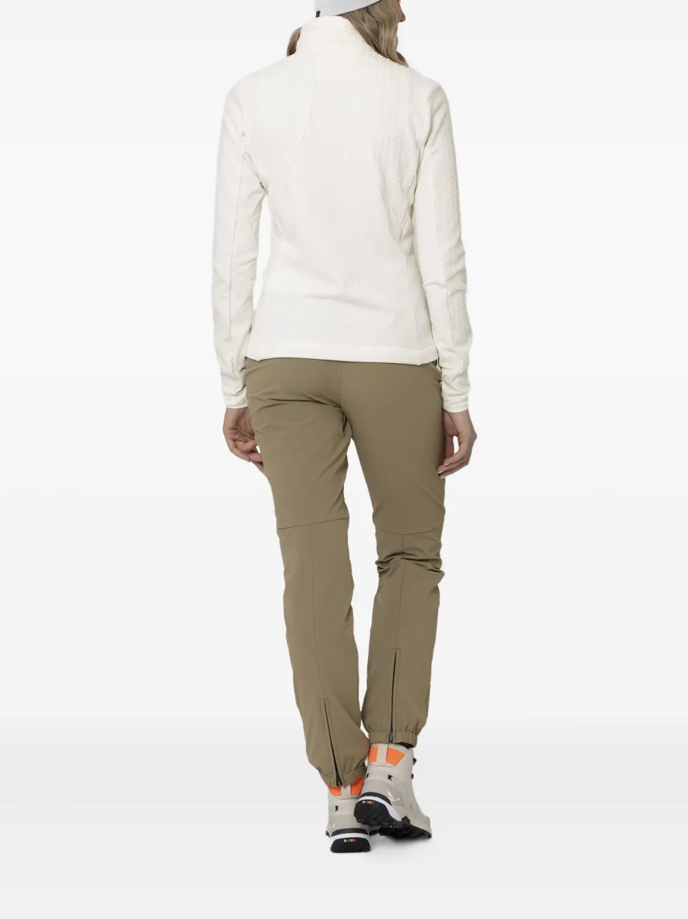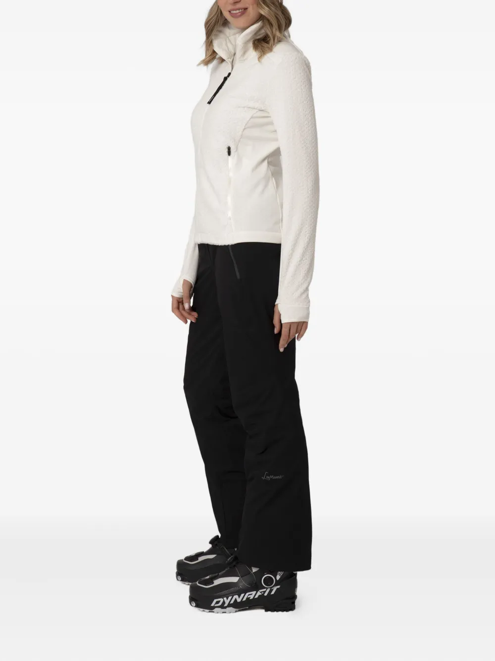 Текстурированный флис бежевого цвета, застежка-молния, высокий ворот, длинные рукава, два кармана на молнии.