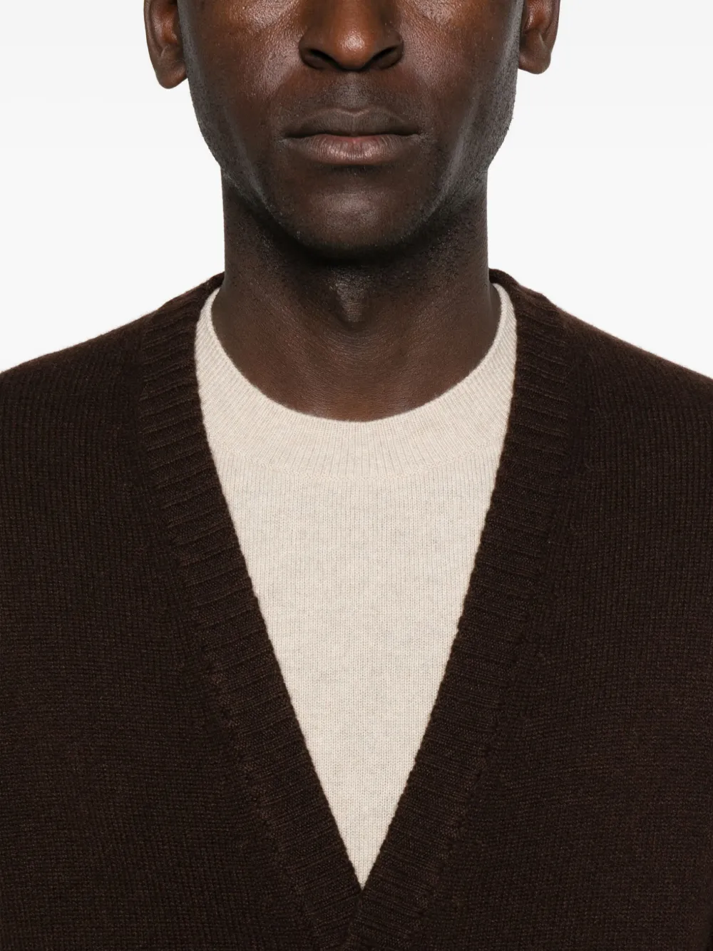Коричневый V-образный вырез, застежка на пуговицы, длинные рукава, прямой подол, накладные карманы.