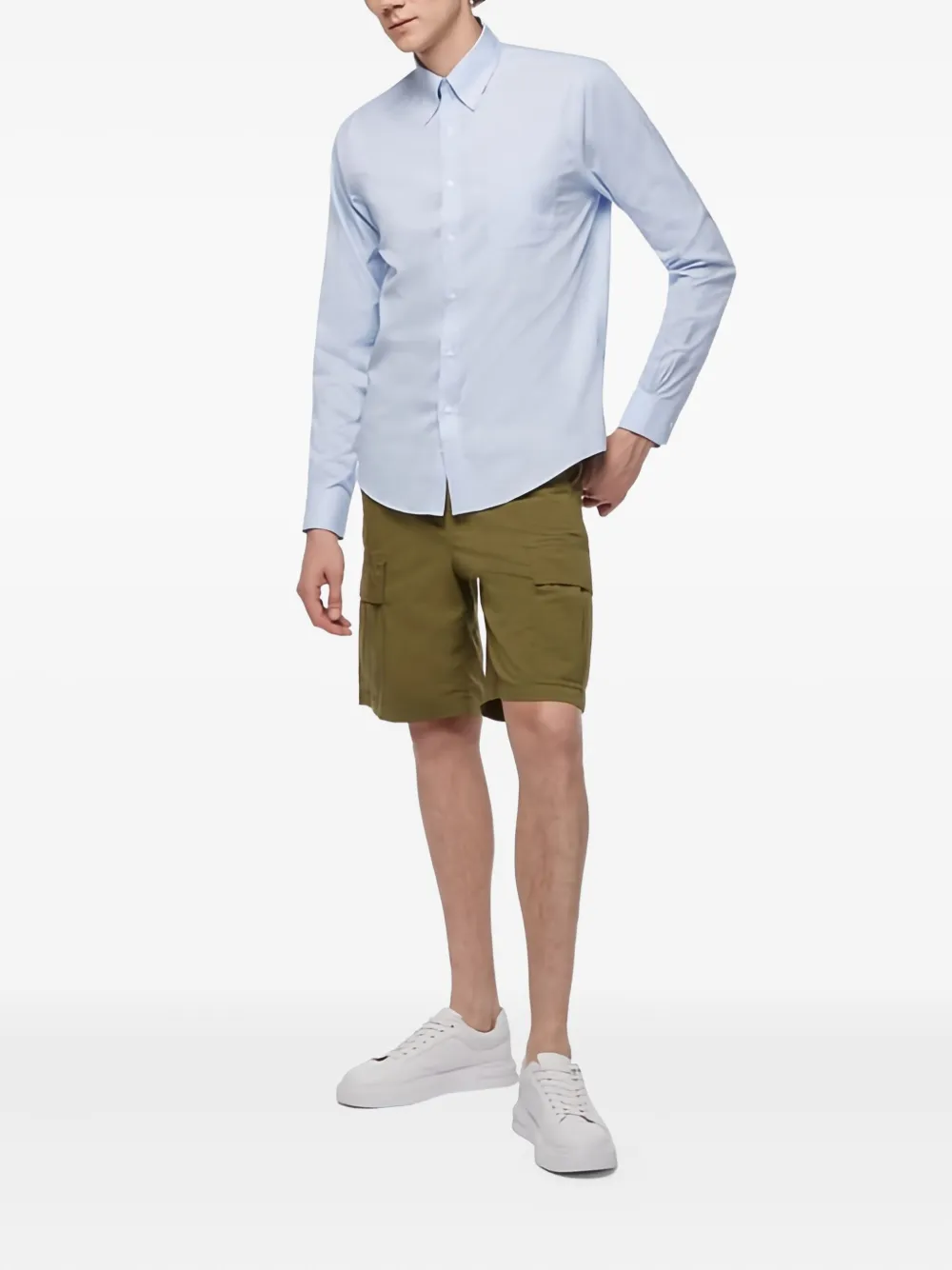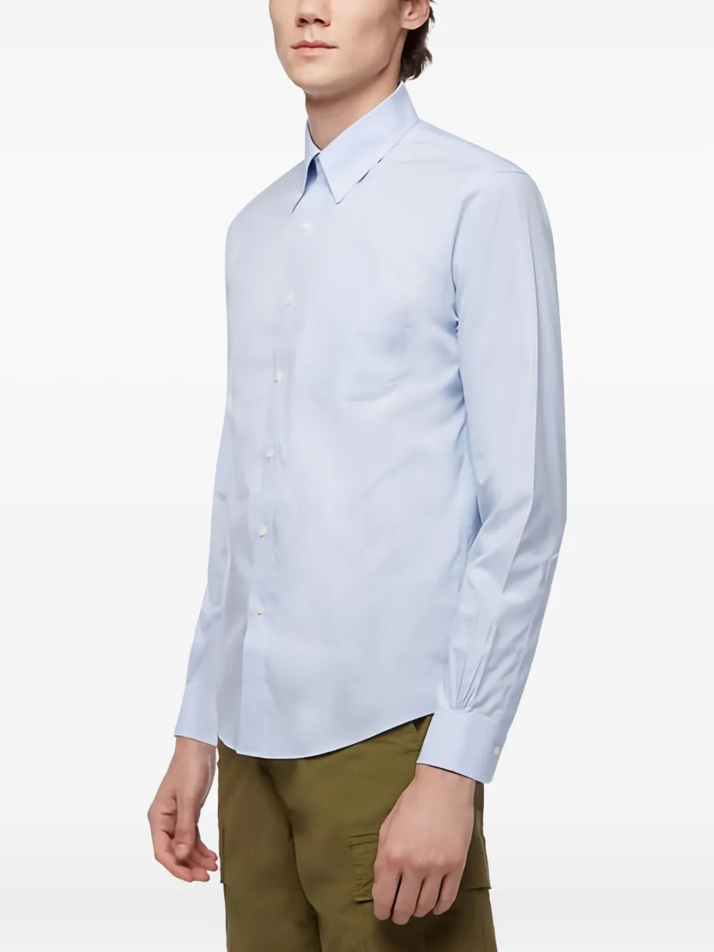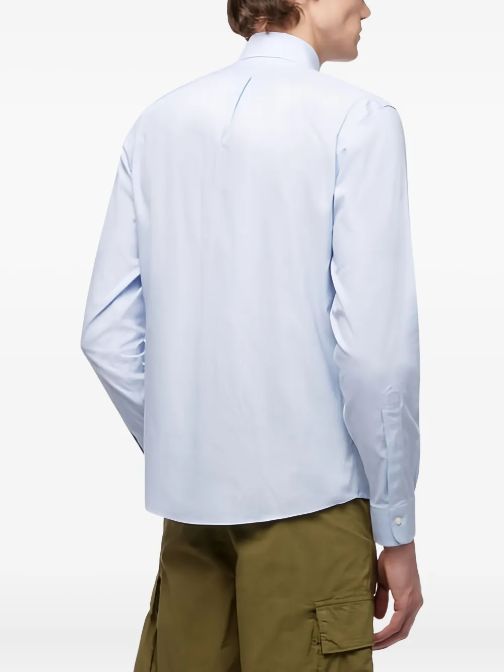 Застежка на пуговицы синего цвета, накладной карман, длинные рукава, манжеты на пуговицах, воротник на пуговицах, закругленный подол.