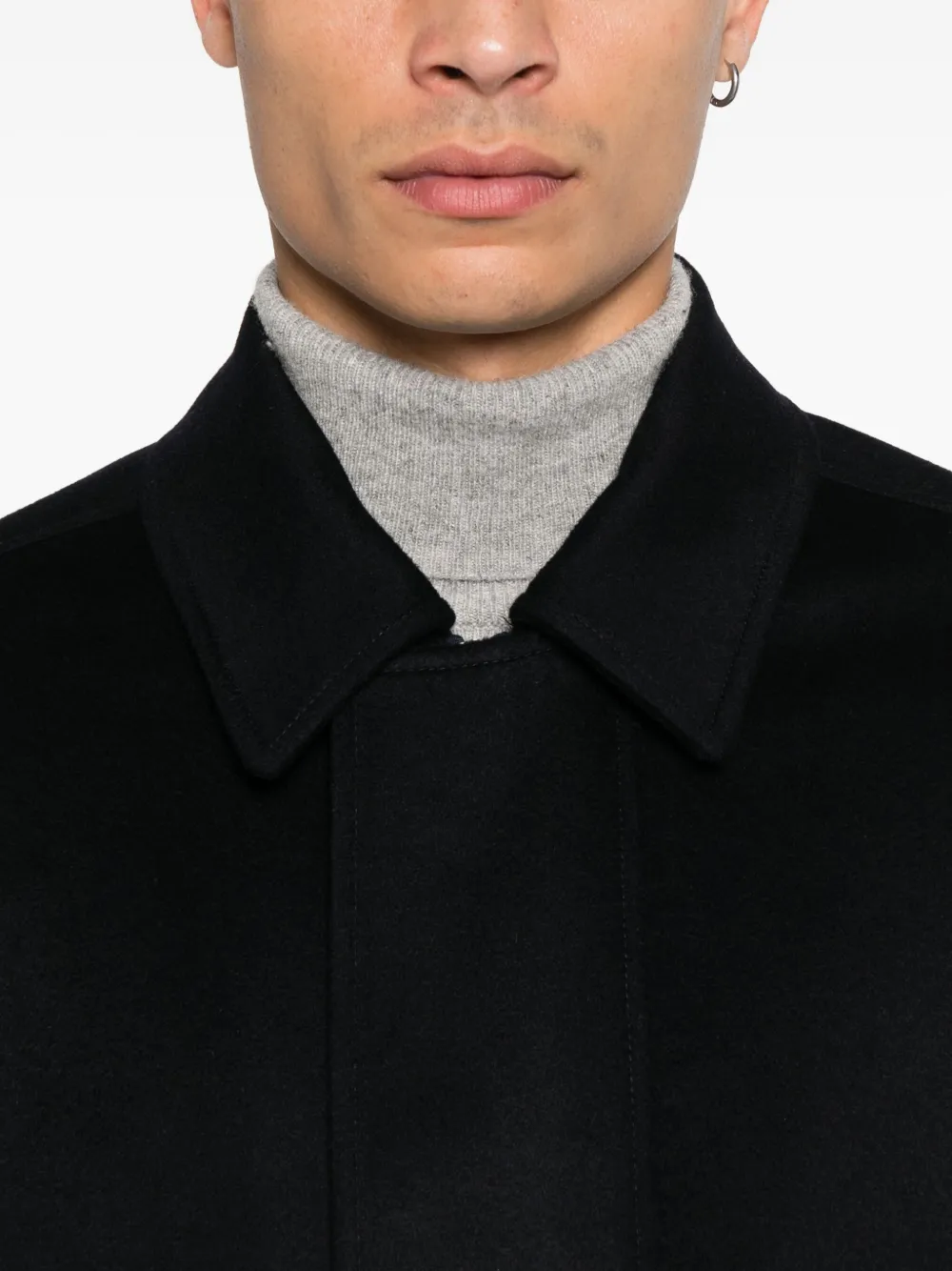 Черный воротник, передние накладные карманы, застежка по центру спереди, длинные рукава.