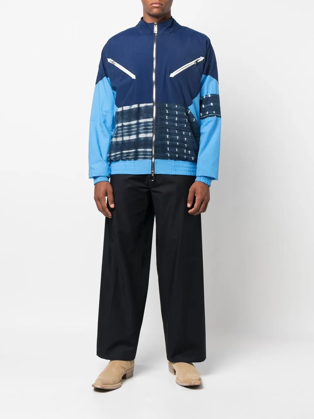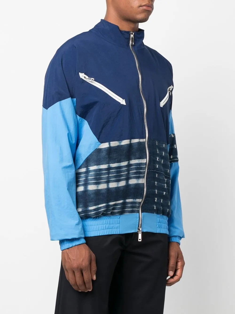 Синий, техника пэчворк, стиль колор-блок, эффект обесцвечивания, воротник-труба, застежка на молнии спереди, серебристая фурнитура, длинные рукава, эластичные манжеты, два нагрудных кармана на молнии и эластичный подол.