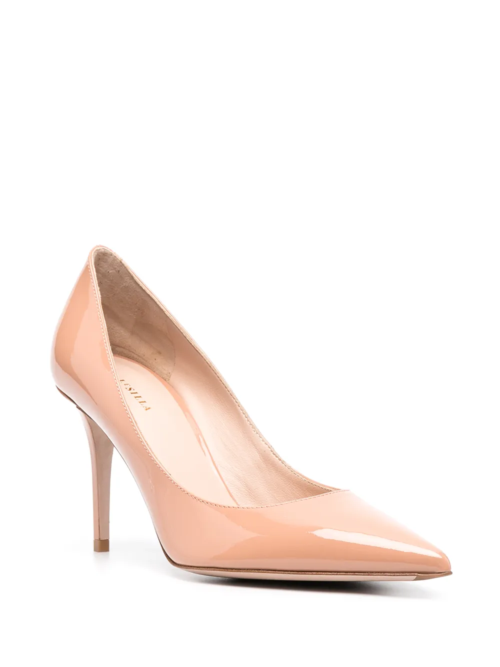 Заостренный носок, стелька с логотипом и высокий каблук.