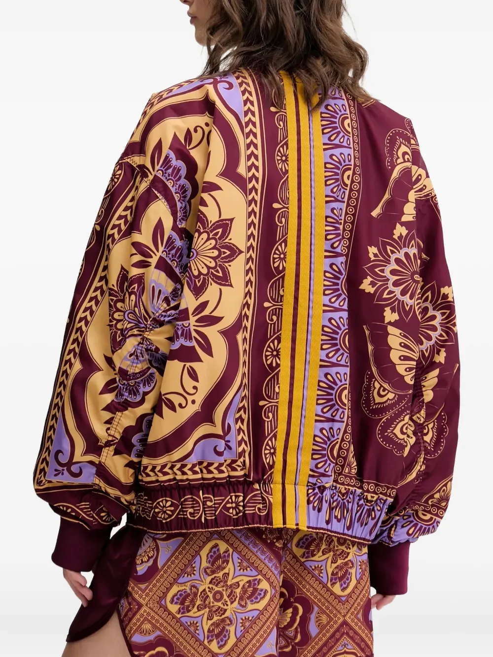 Бордовый узорчатый дизайн, застежка-молния спереди, длинные рукава, эластичные манжеты.