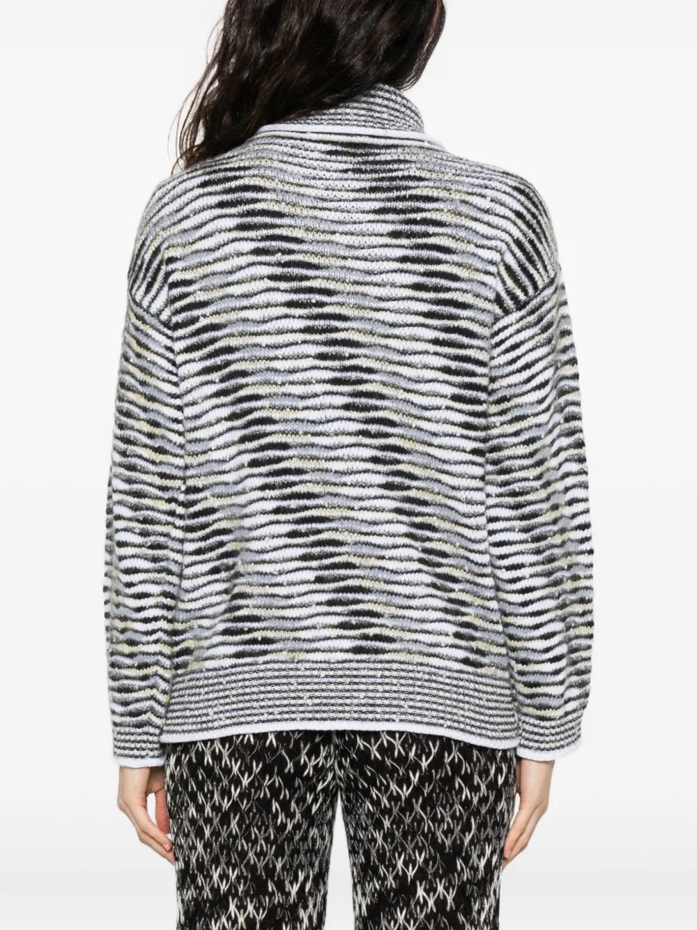 Серый, с высоким воротом, длинными рукавами, ребристыми манжетами и подолом. Полученный вами товар может немного отличаться от представленного на фотографии. Это связано с тем, что все изделия Missoni изготавливаются вручную.