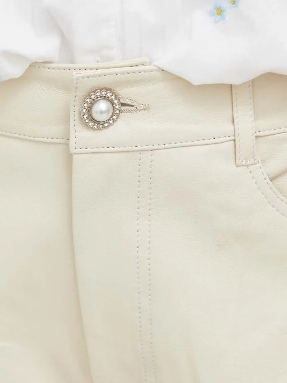 Бежевая кожа, отделка жемчугом, высокая талия, застежка на пуговицы, прорезные карманы