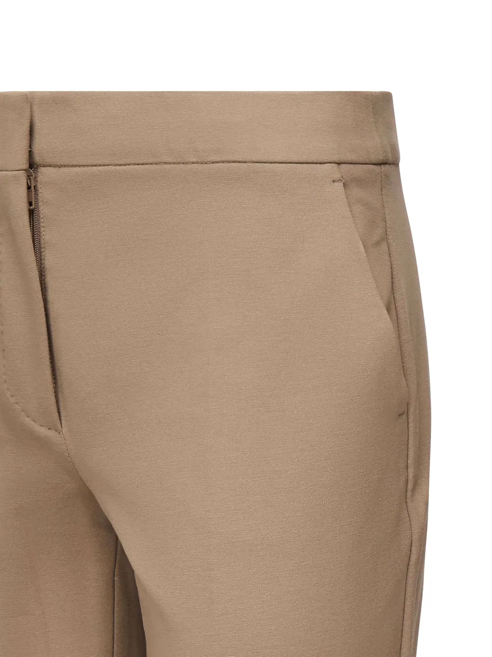 Коричневая застежка-молния, прорезные карманы, запрессованные складки, плоский перед.