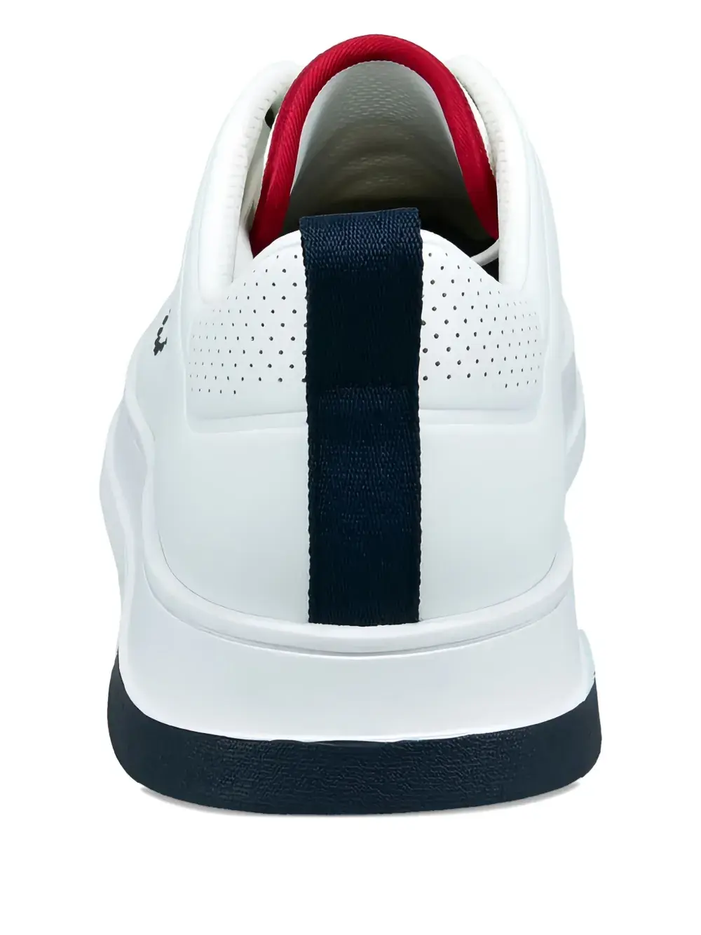 Белая перфорированная деталь, логотип, эмблема, шнуровка, темно-синяя вставка на пятке.