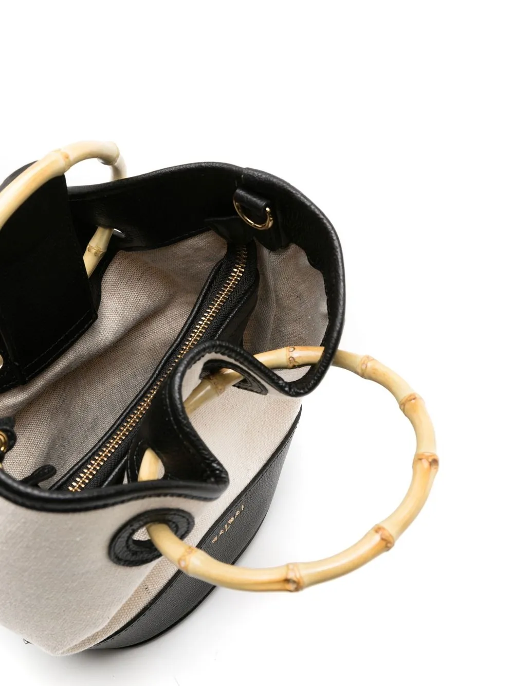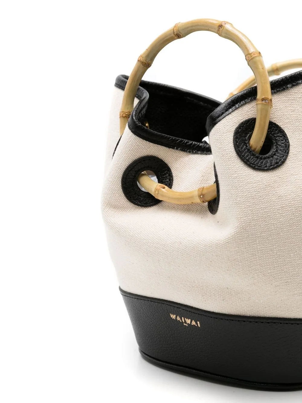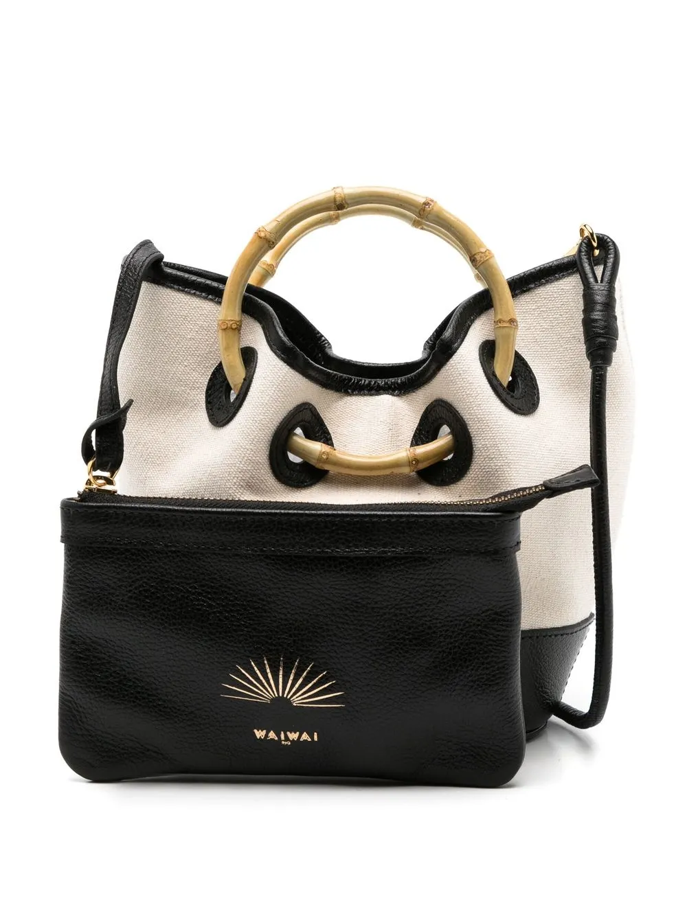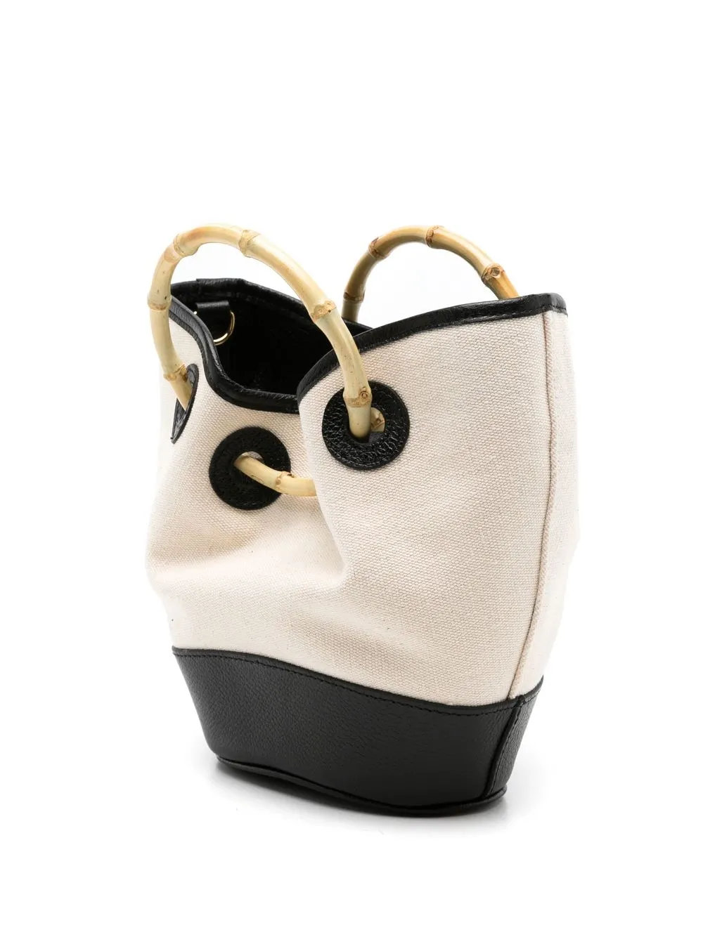 Кремовый, черный, хлопок, кожа, сочетание двух оттенков, тисненый логотип спереди, детали из бамбука, круглые ручки, съемный регулируемый ремень на плечо, основное отделение и съемная косметичка.