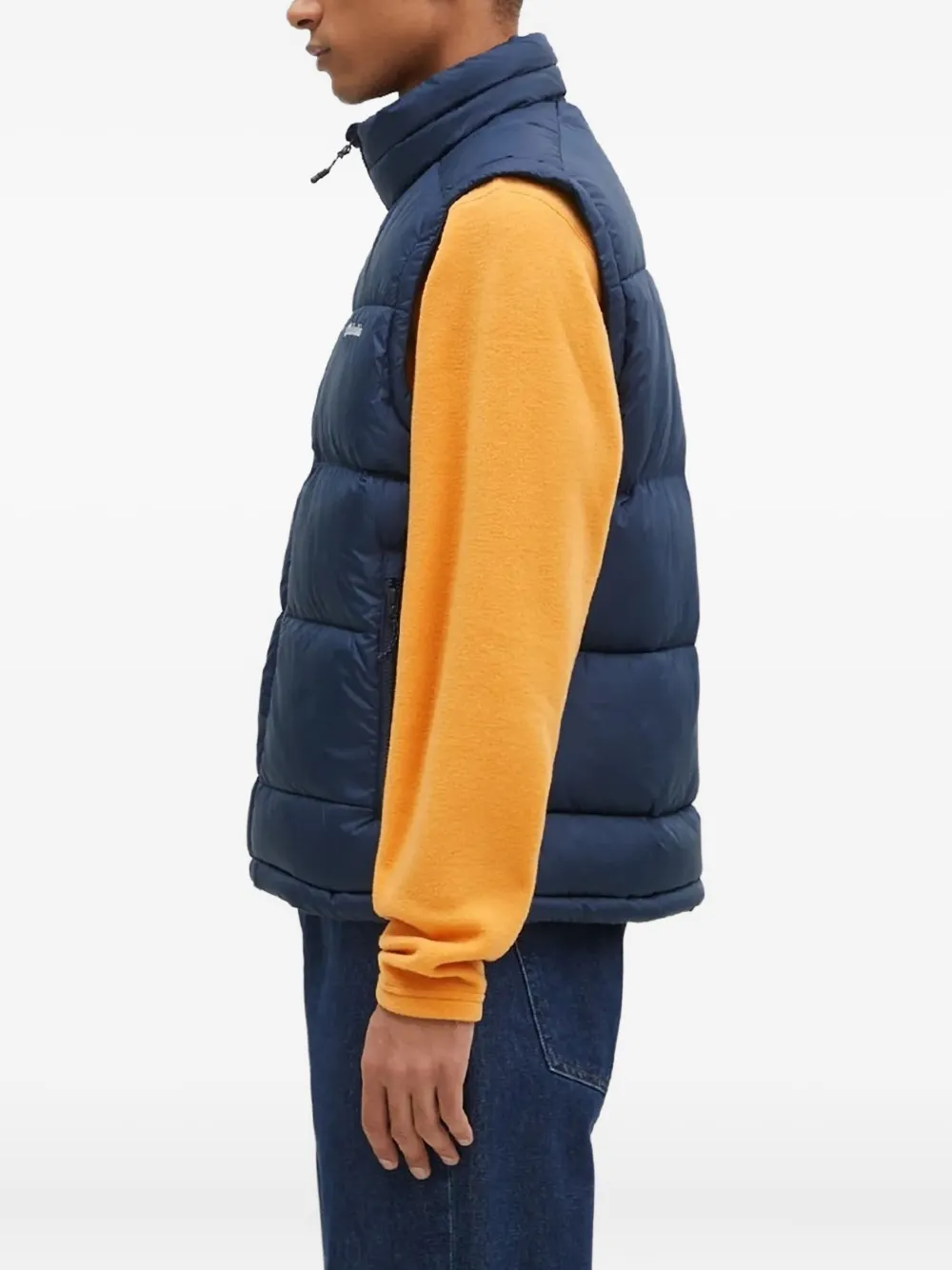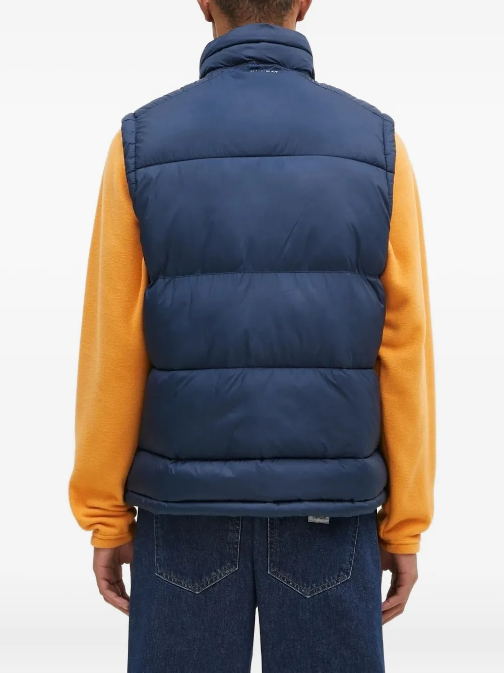 Темно-синяя стеганая модель с застежкой-молнией, воротником-стойкой, вышитым логотипом, без рукавов.