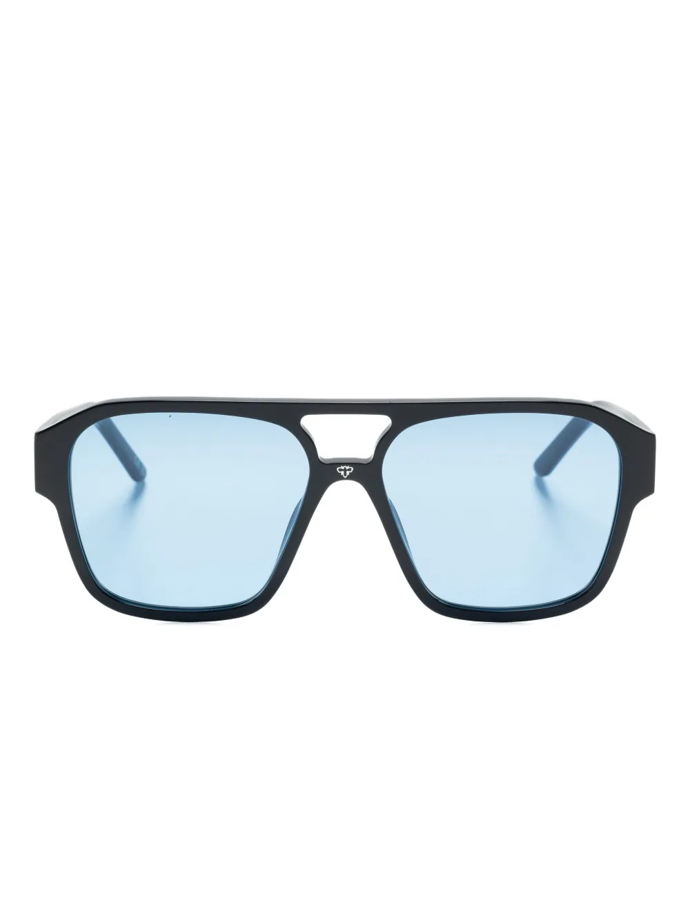 Черные тонированные линзы, оправа «пилот», двойной переносица, логотип. Очки поставляются с защитным футляром.
