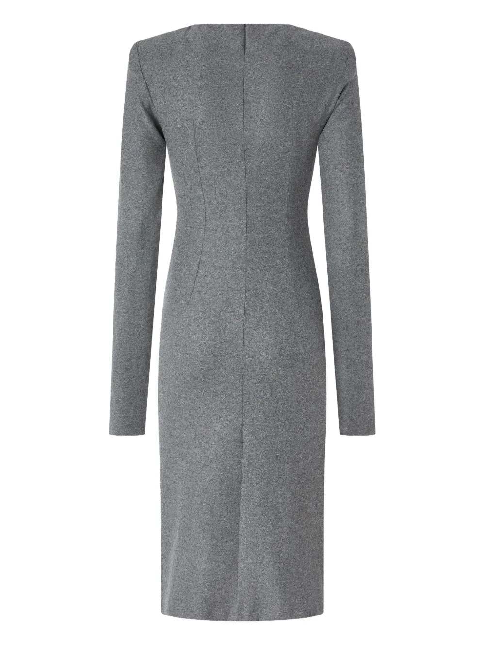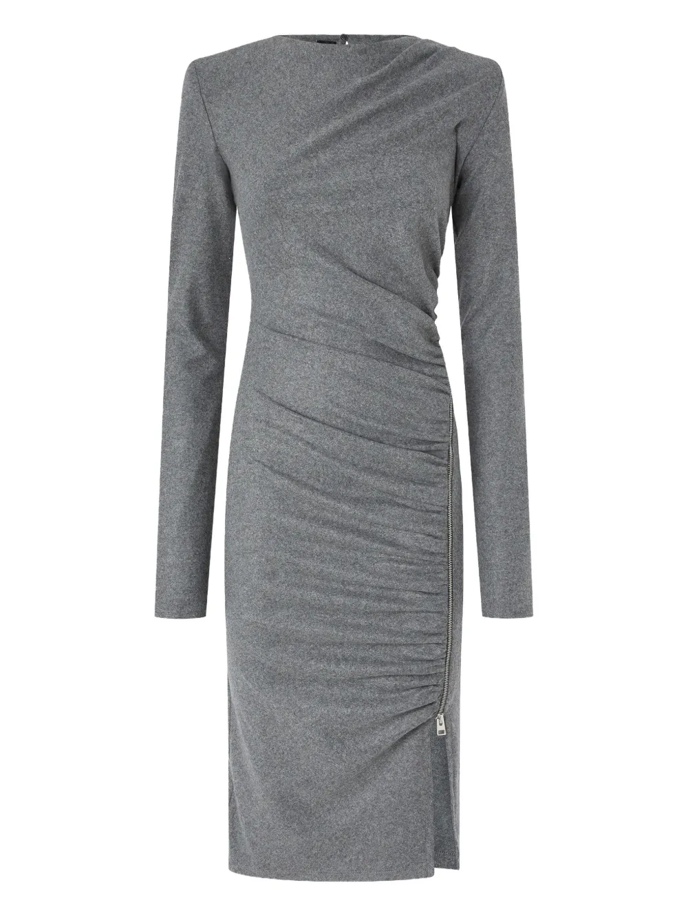 Темно-серая потайная застежка-молния сзади, деталь на молнии, лиф со сборками, длинные рукава.