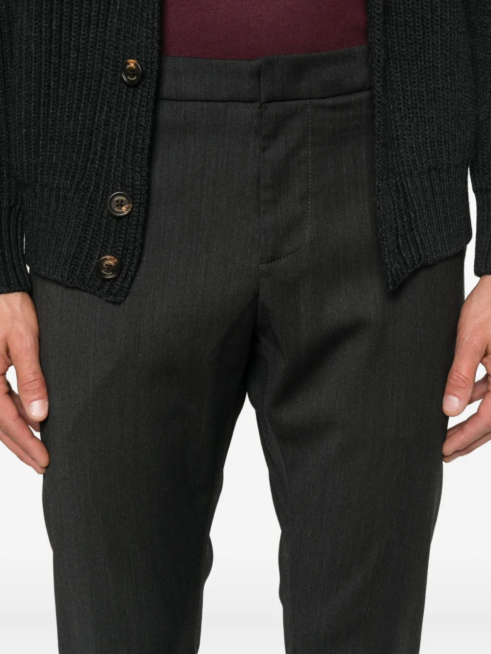 Серый узор в тонкую полоску, манжеты, передние карманы, гульфик на пуговицах