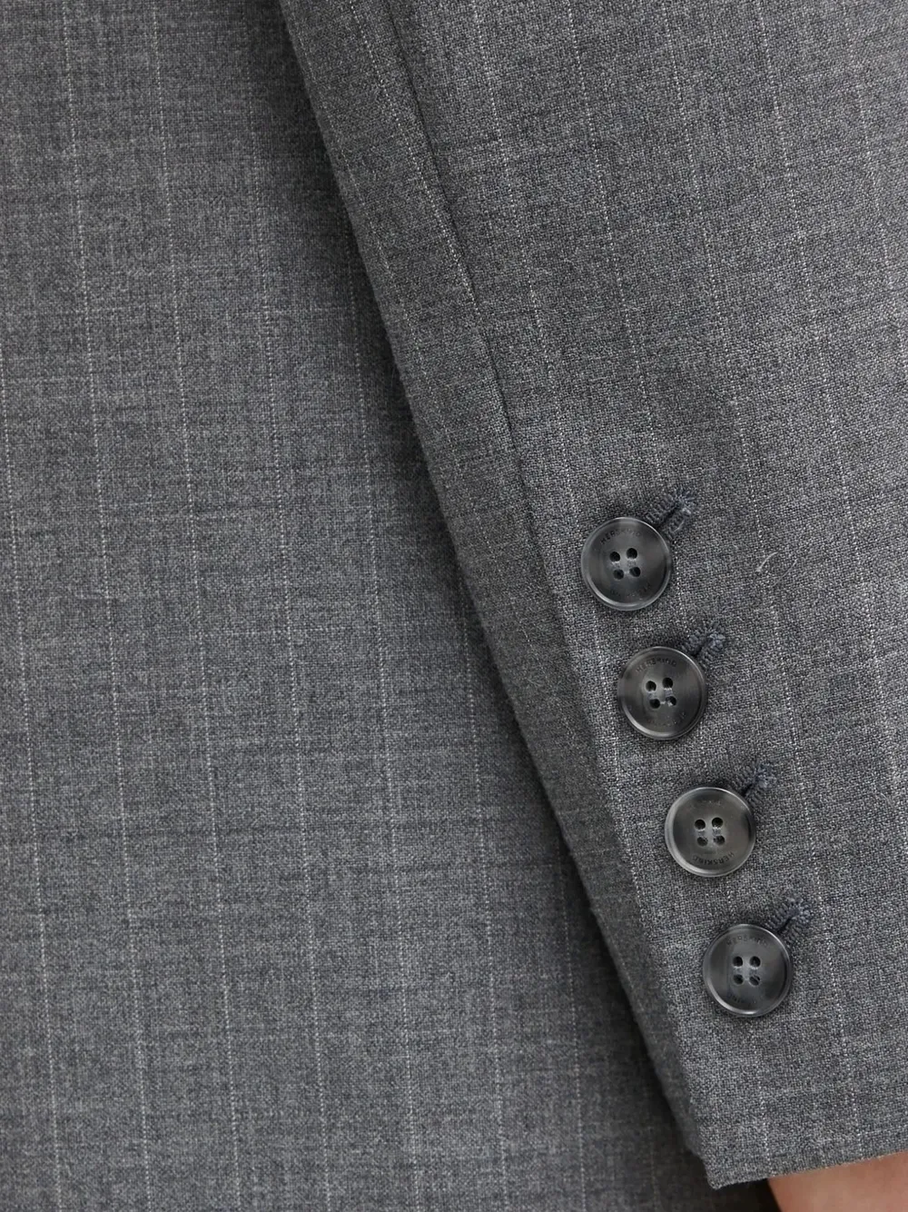 Светло-серый узор в тонкую полоску, двубортный, застежка с отворотом, длинные рукава.