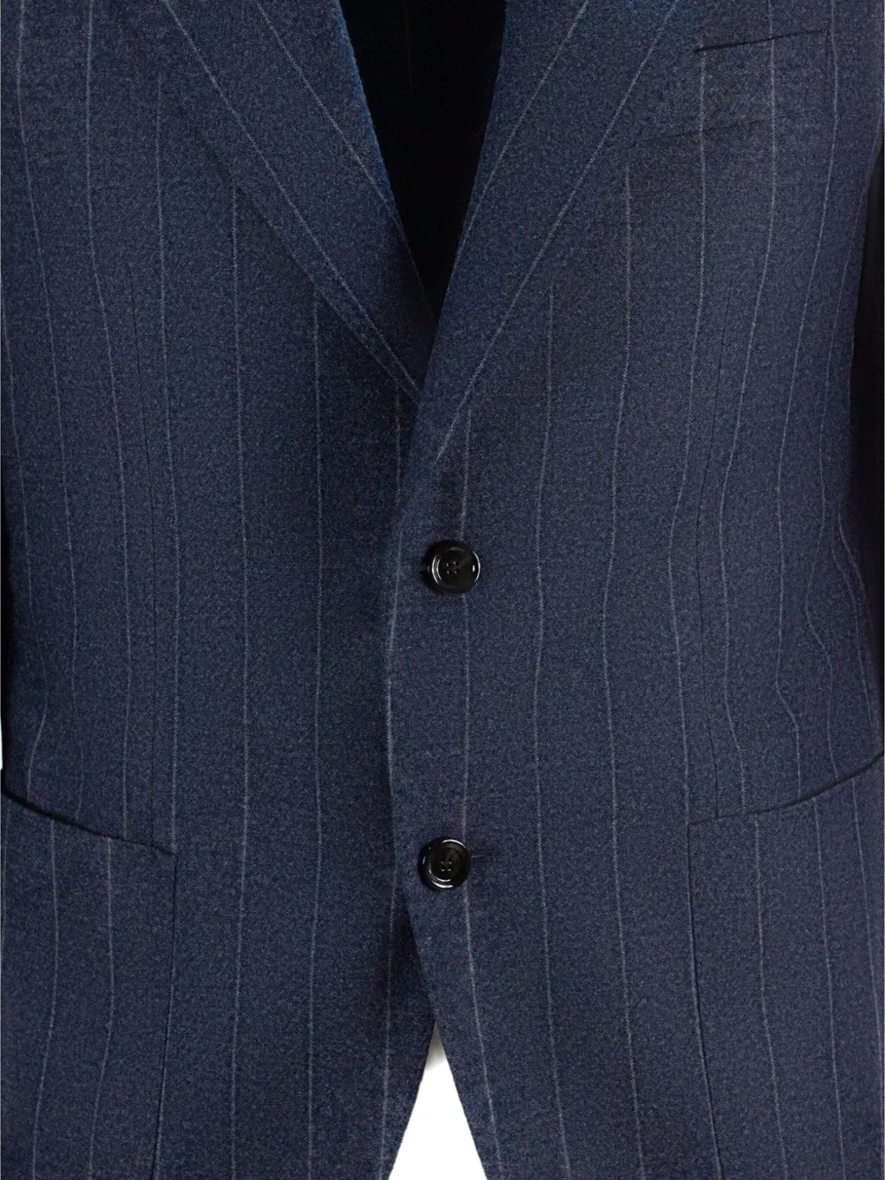 Синий узор в тонкую полоску, застежка на две пуговицы, классический лацкан, декоративная булавка, накладные карманы