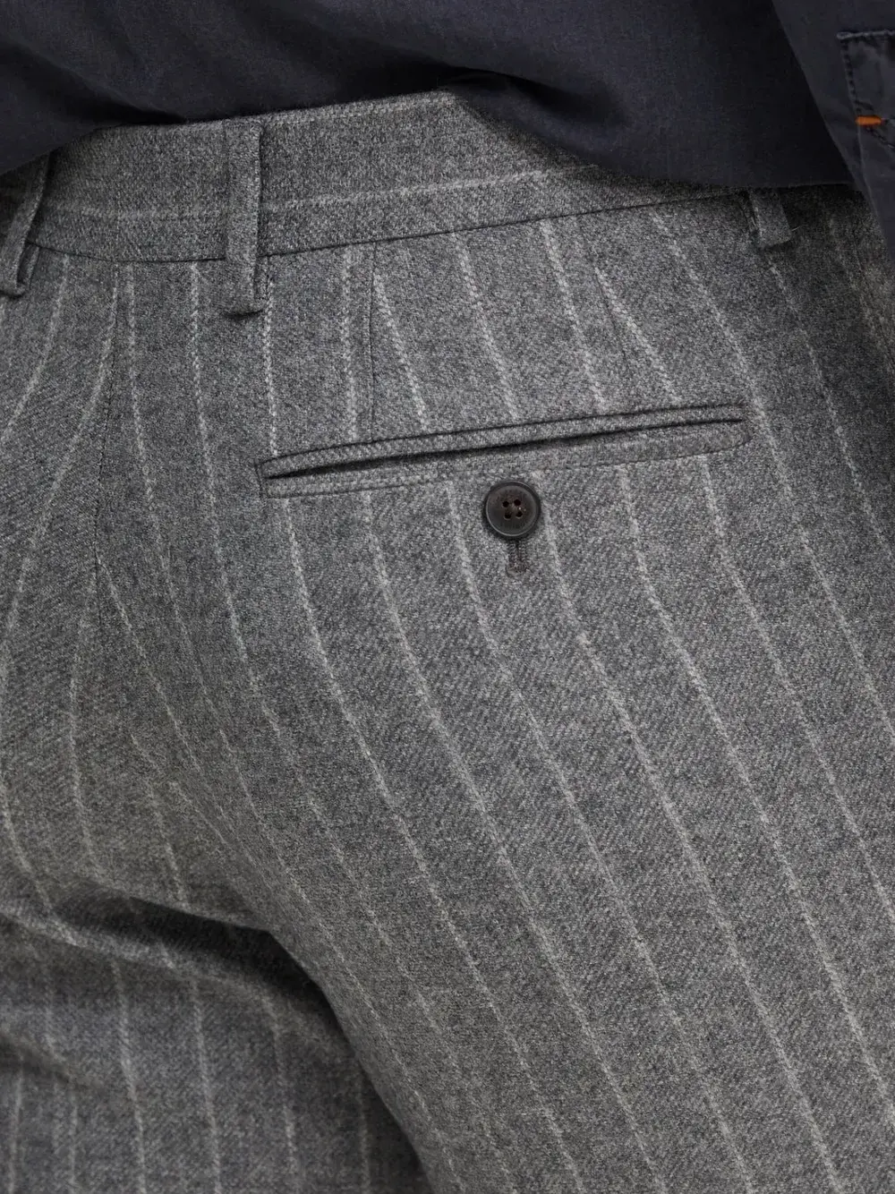 Серый узор в тонкую полоску, застежка на пуговицы, прорезные карманы, прямой крой.