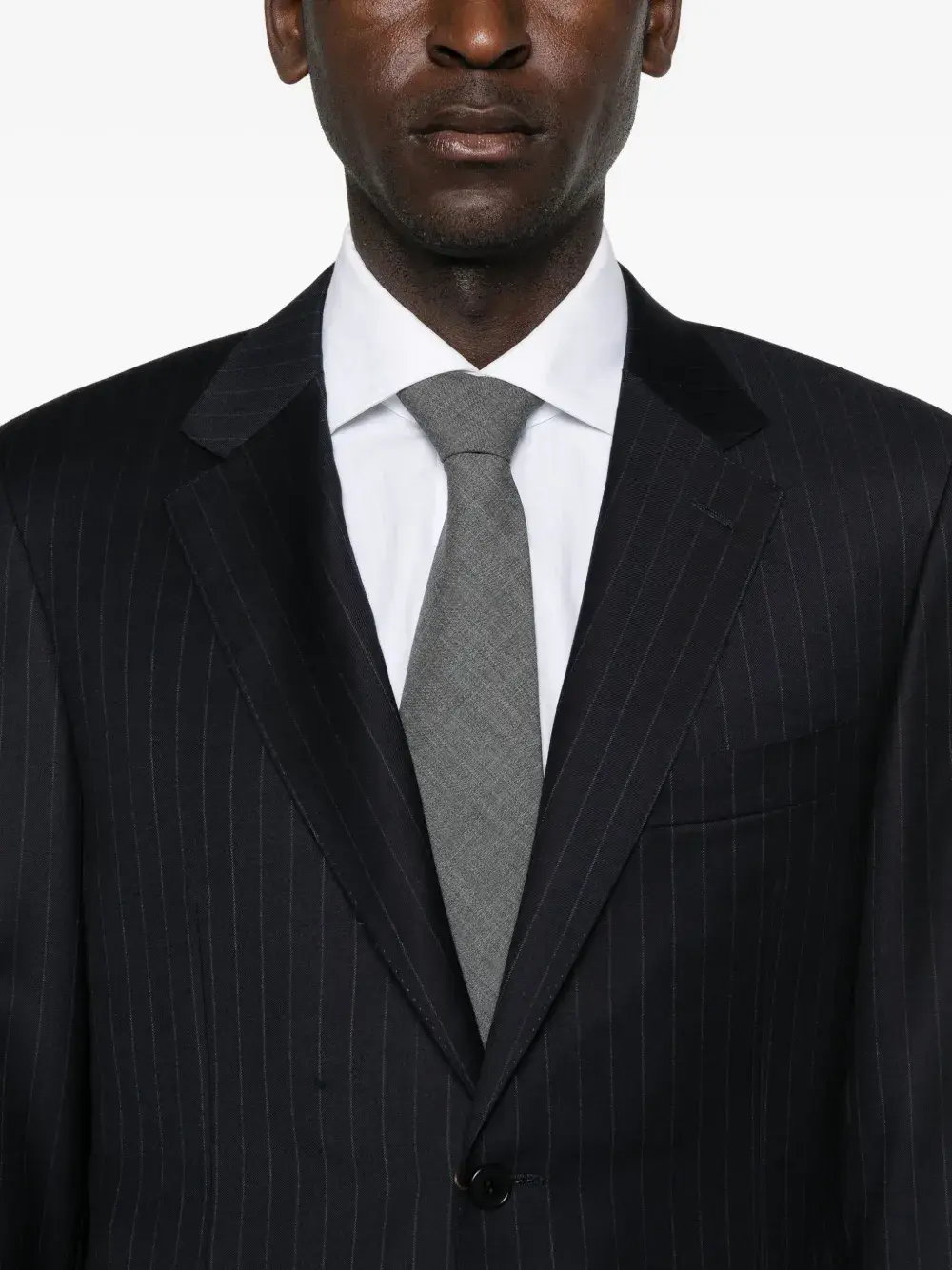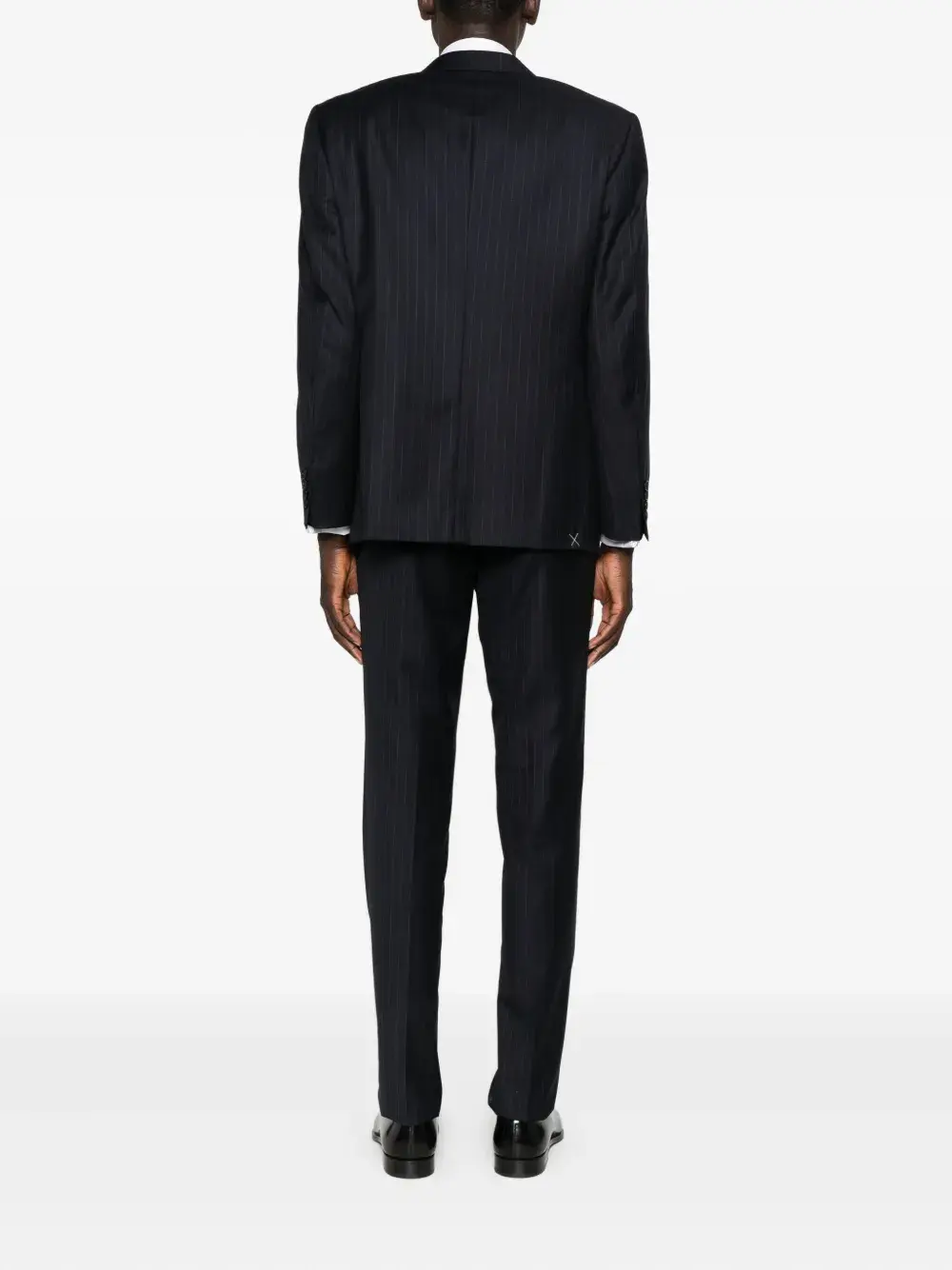 Темно-синий узор в тонкую полоску, застежка на две пуговицы, заостренные лацканы
