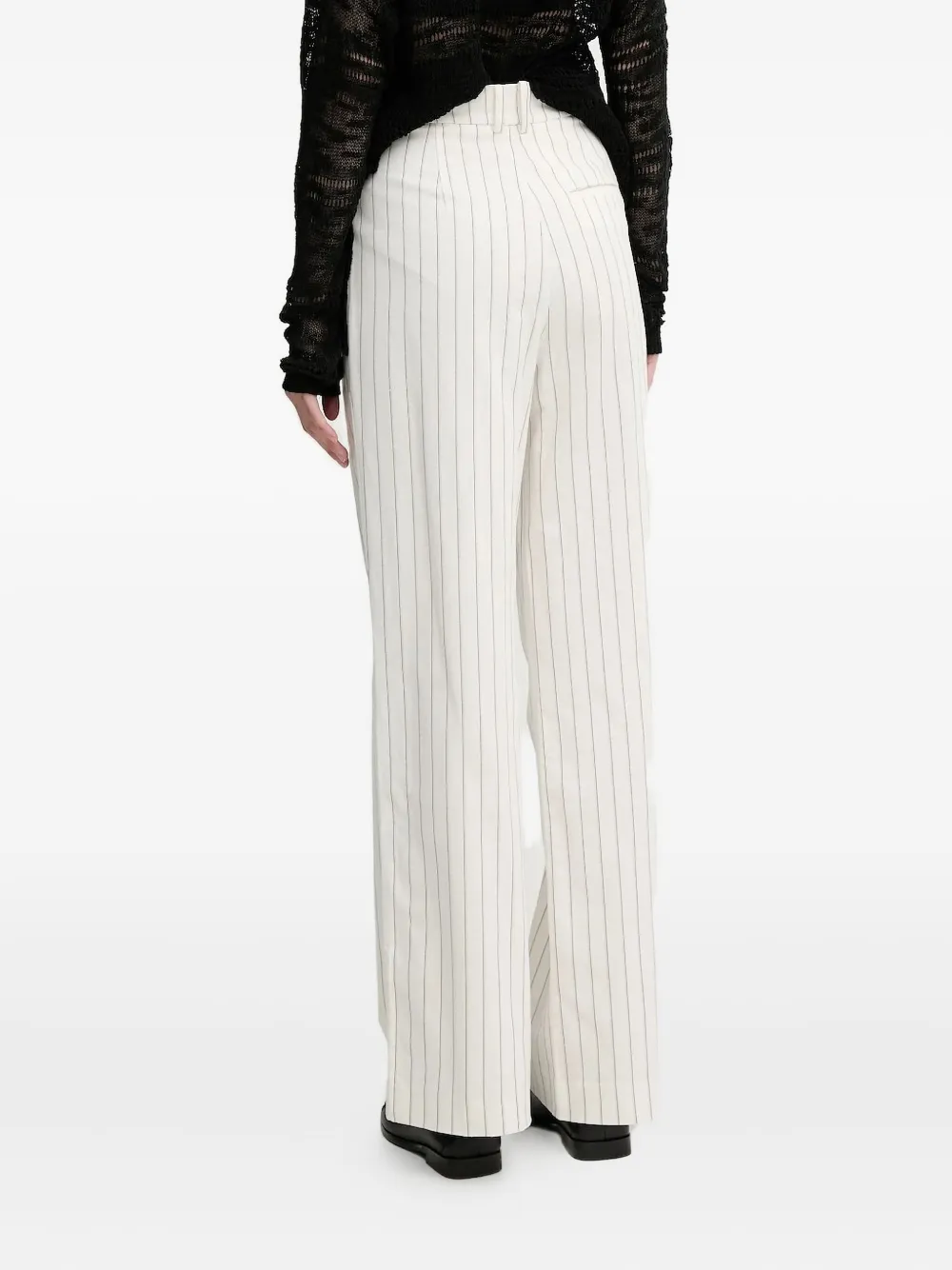 Белый узор в тонкую полоску, складки спереди, высокая талия, прямой крой