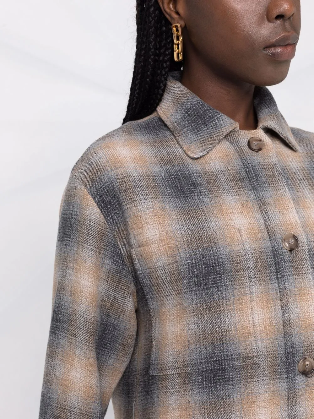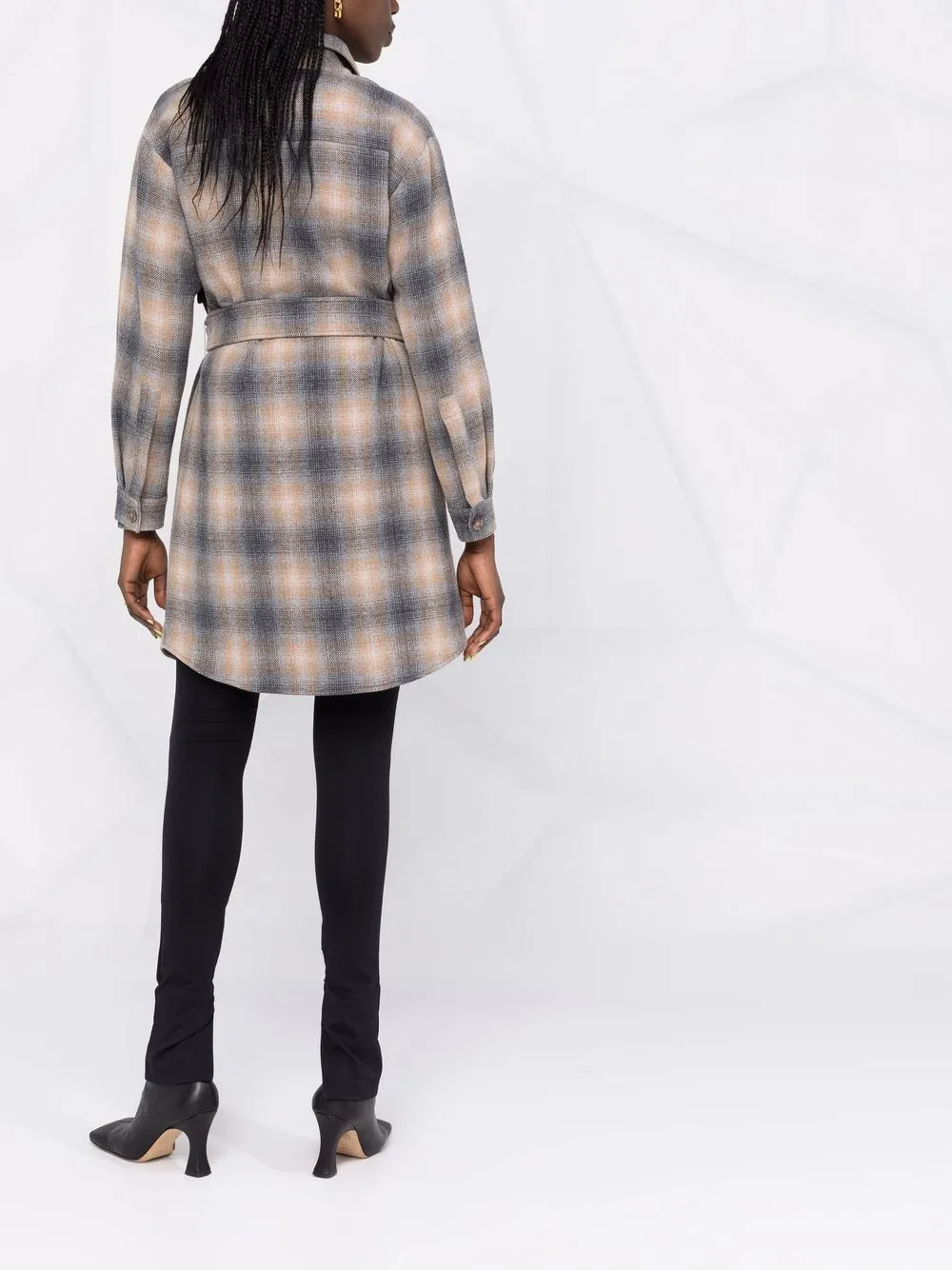 Принт в клетку, ремень на талии, воротник на пуговицах, длинные рукава и два накладных кармана на груди.