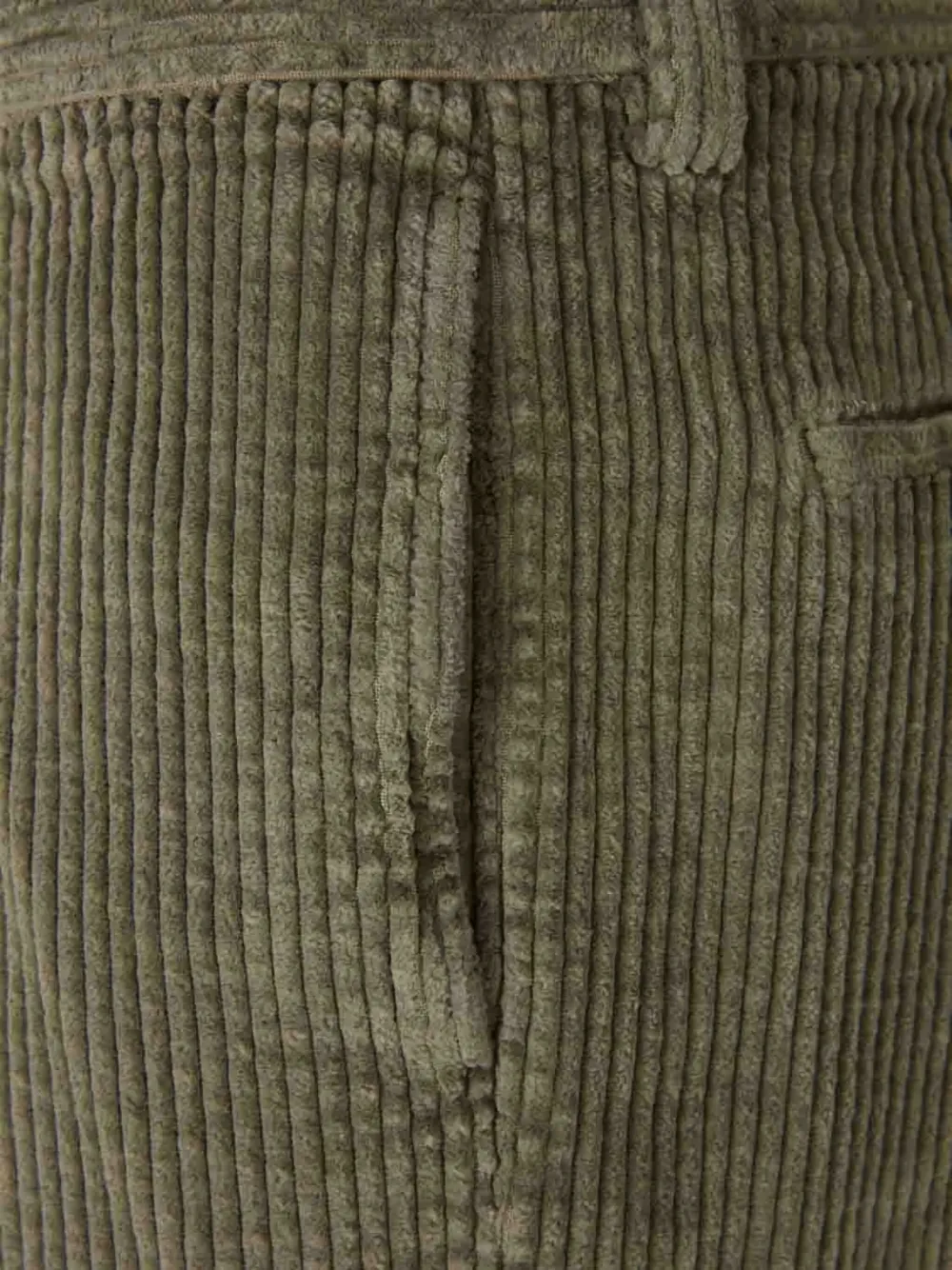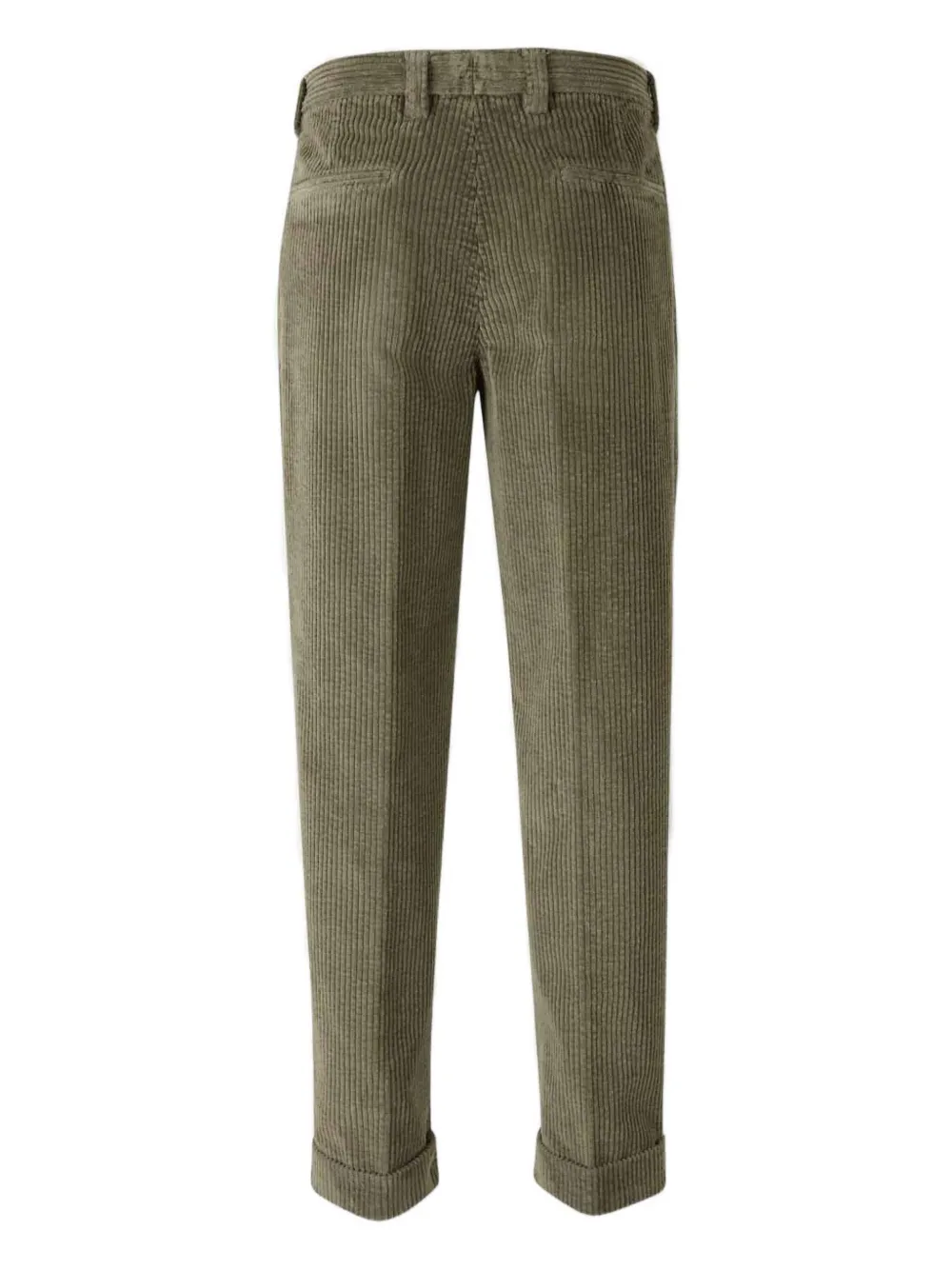 Оливково-зеленая вельветовая текстура, складки спереди, застежка на пуговицы спереди, прорезные карманы сзади, отвороты по низу