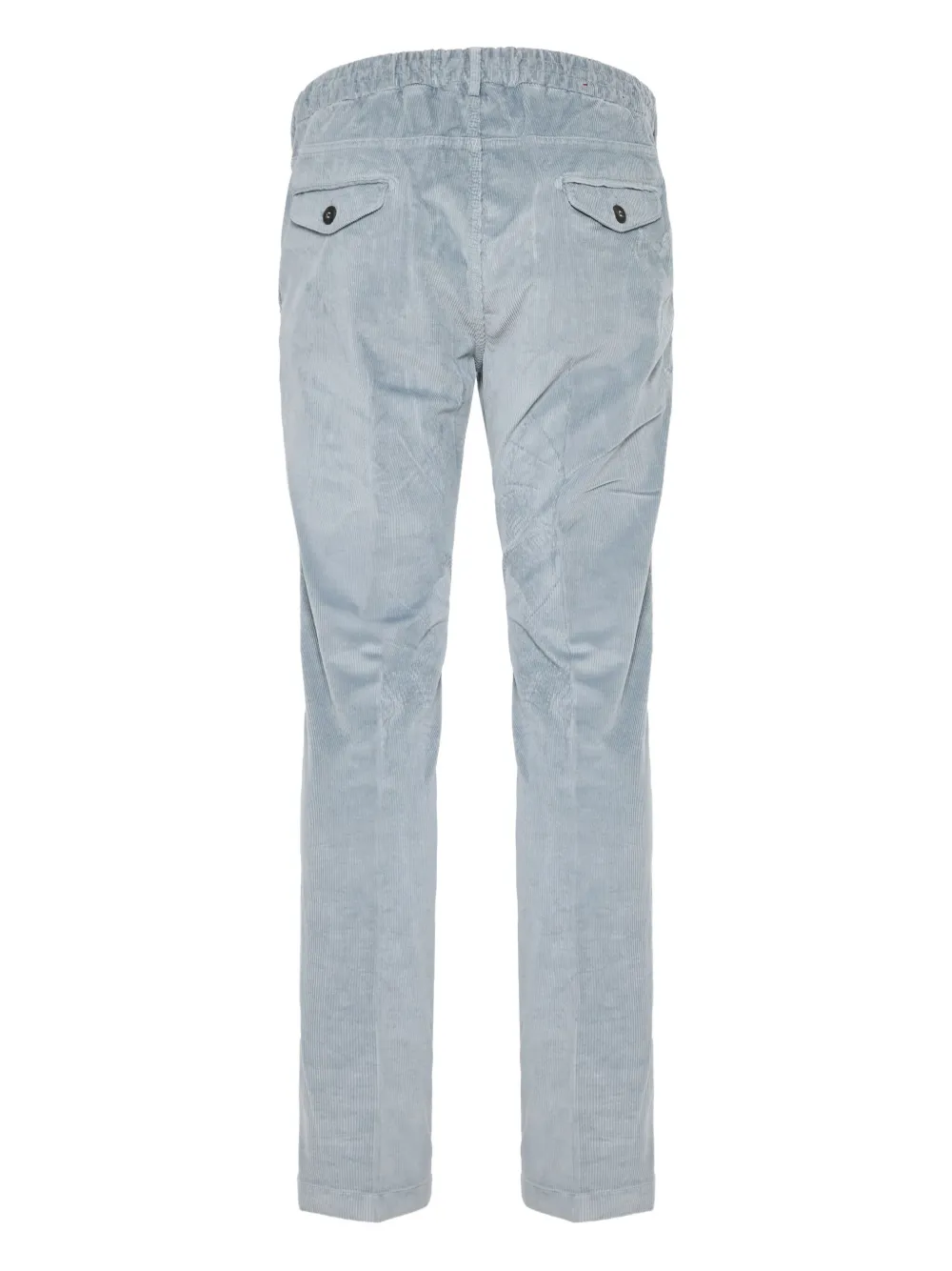 Светло-голубая вельветовая текстура, плиссировка спереди, завязка на шнурке, прорезные карманы по бокам, застежка на пуговицы