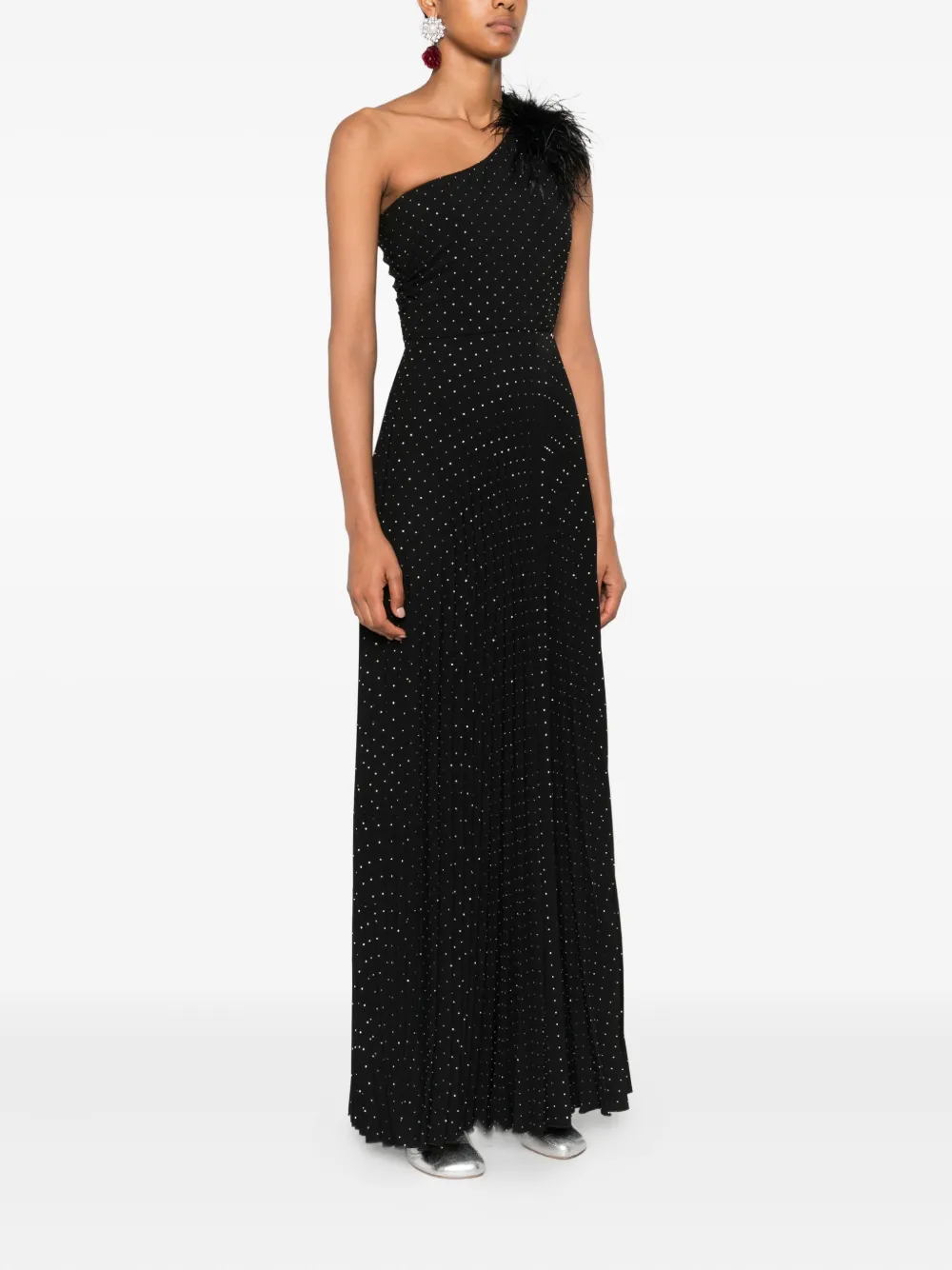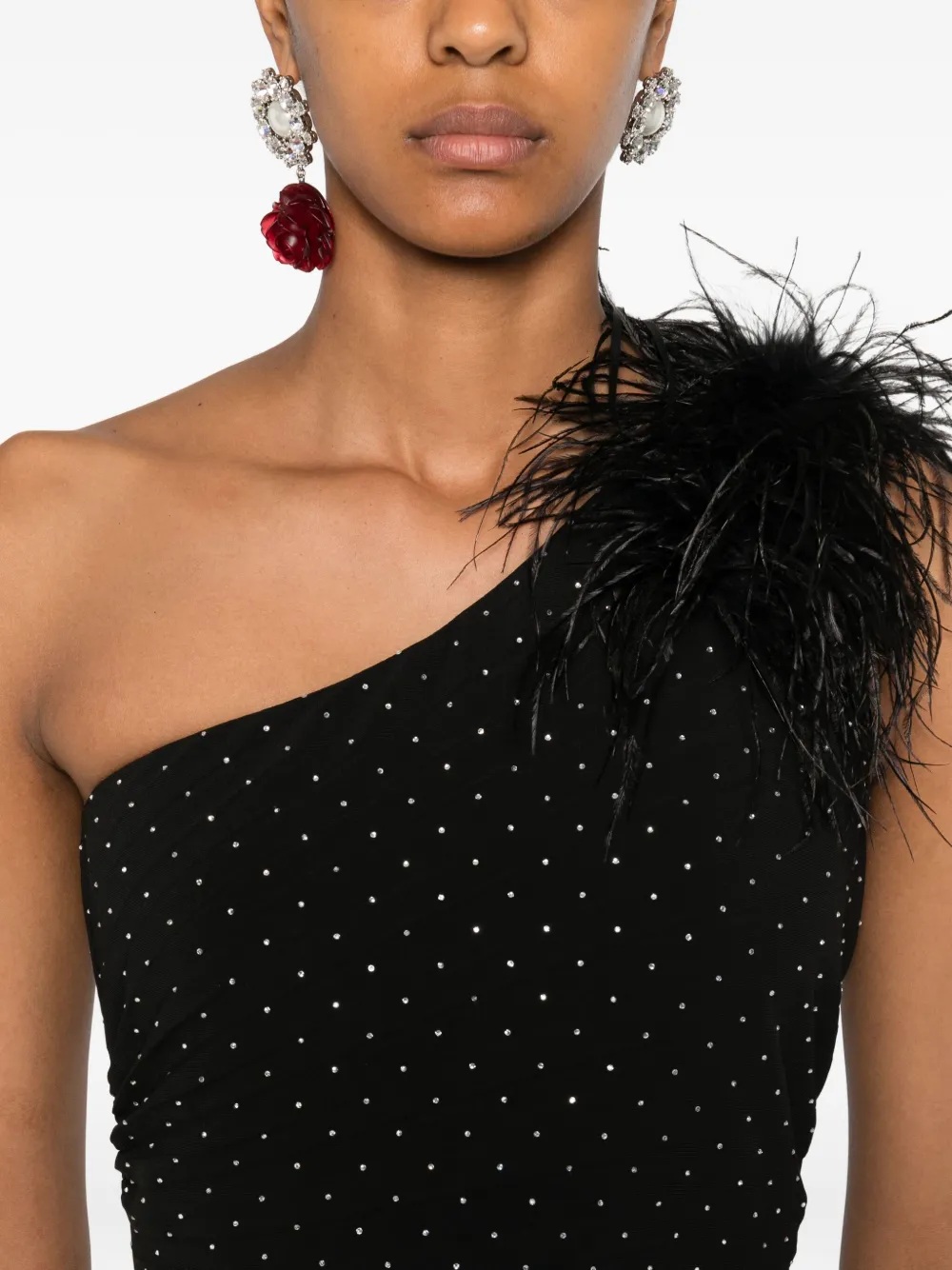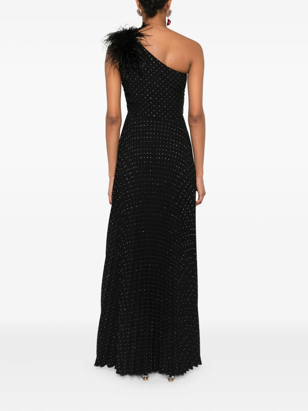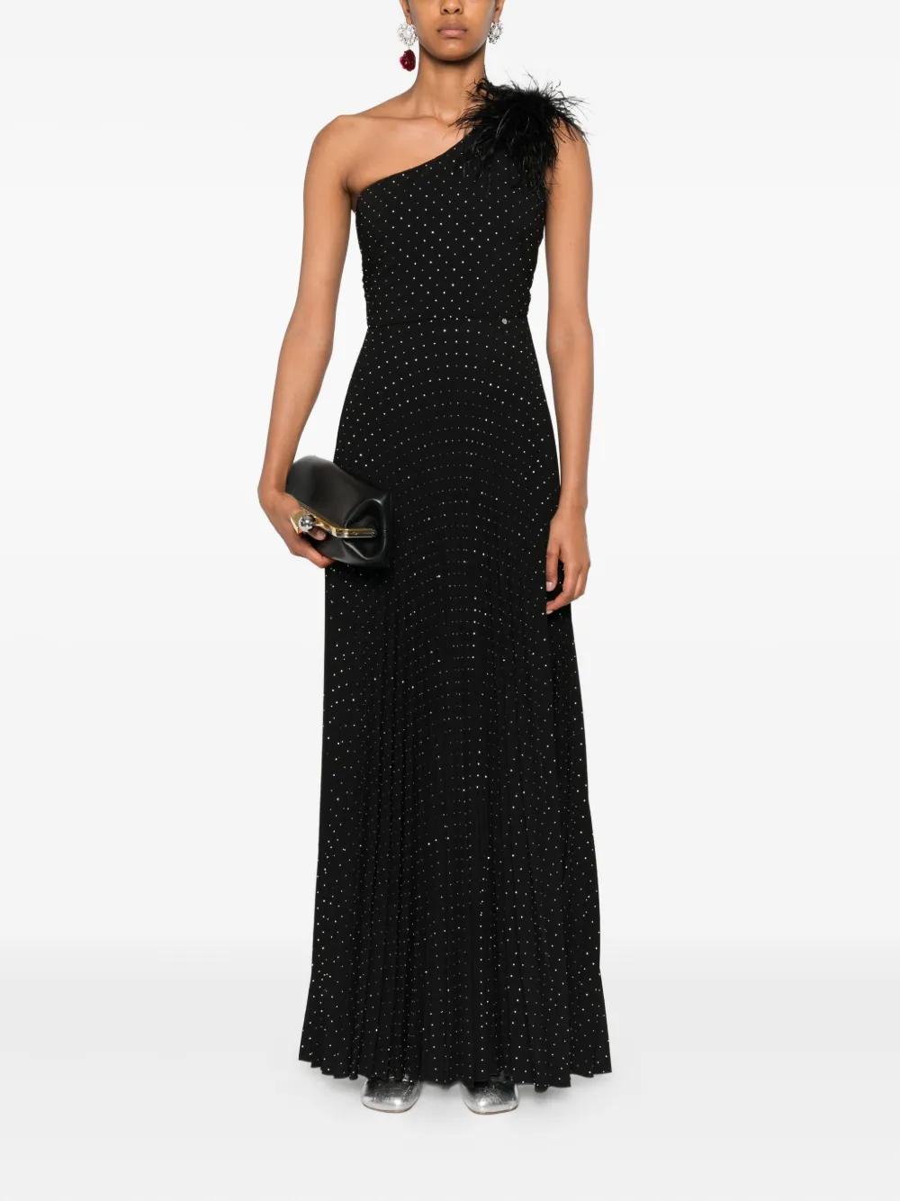 Черная плиссированная юбка с декором в горошек, на одно плечо, с отделкой перьями, длина макси