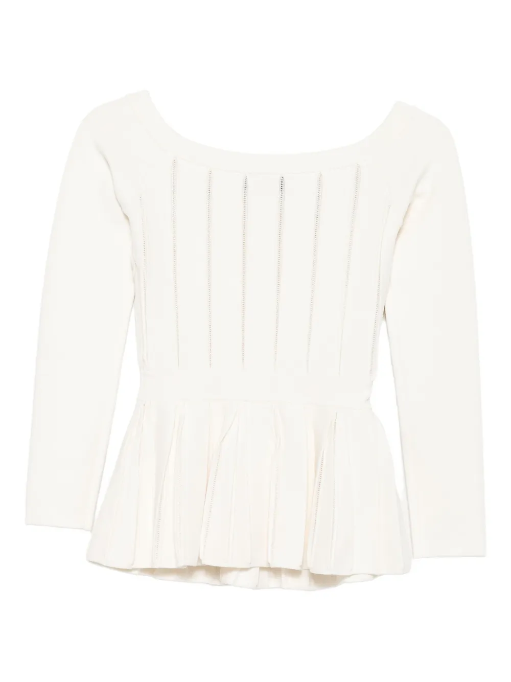 Белоснежный плиссированный подол, длинные рукава, лиф со вставками, вырез с открытыми плечами, едва заметные швы