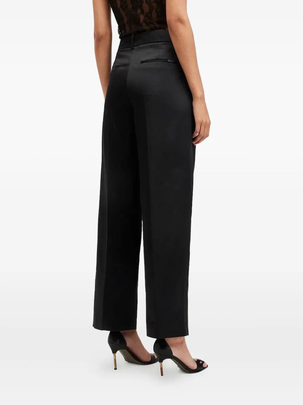 Черная атласная ткань, центральные складки, прямые штанины, прорезные карманы по бокам.