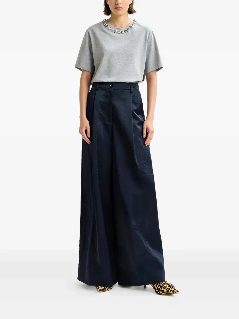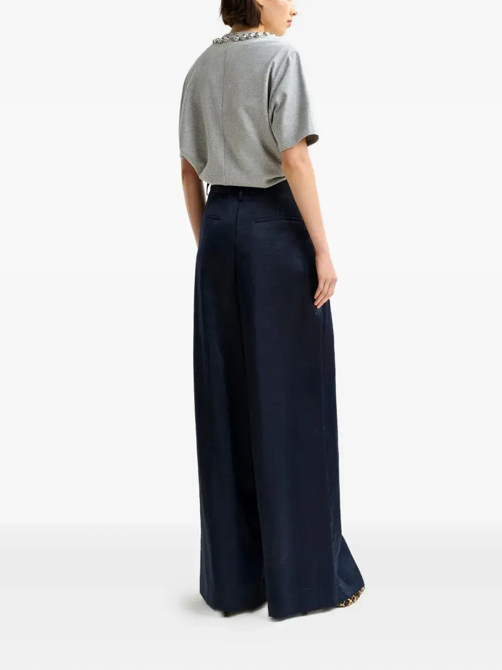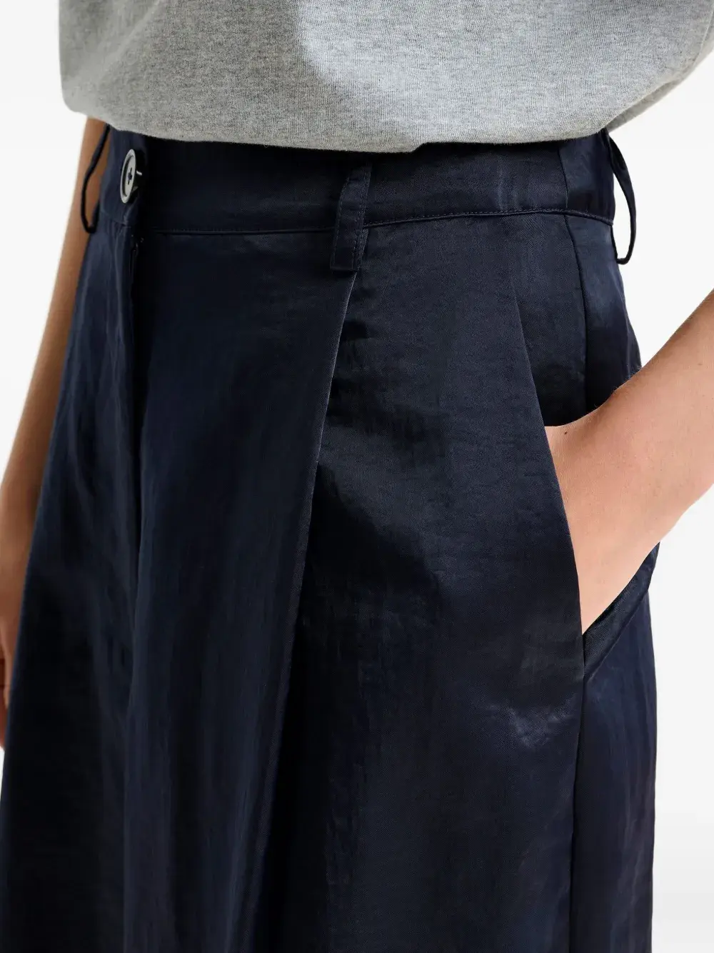 Синие плиссированные широкие штанины спереди, прорезные карманы на крючках и молниях