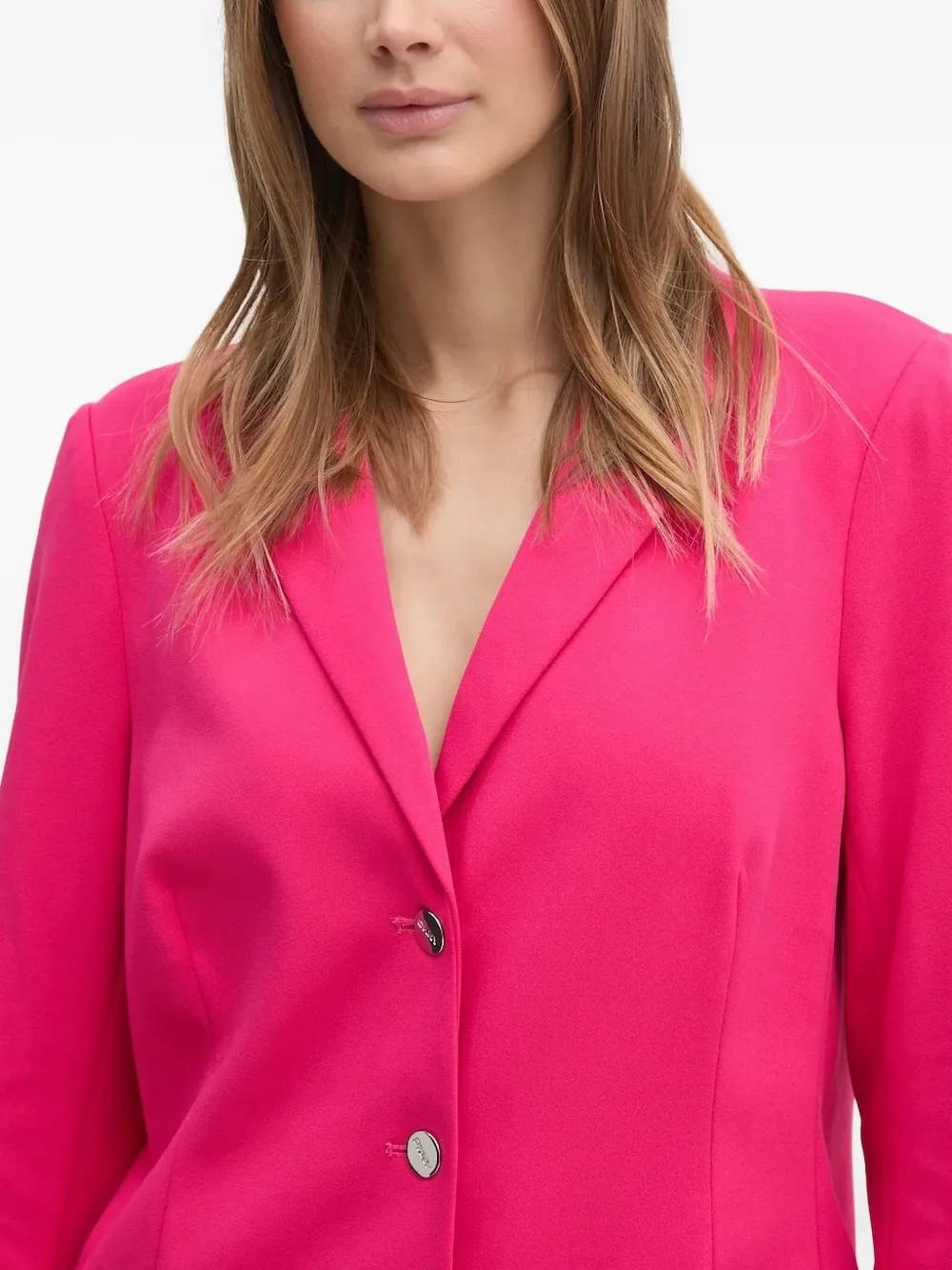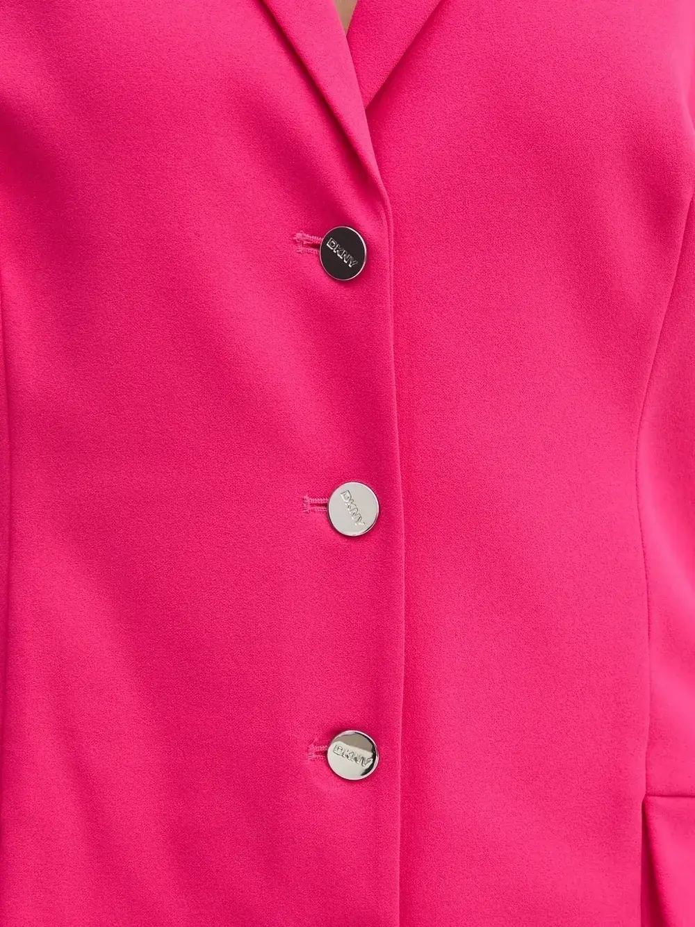 Ярко-розовая плиссированная юбка, застежка на пуговицы спереди, заостренные лацканы, длинные рукава, многослойный дизайн.