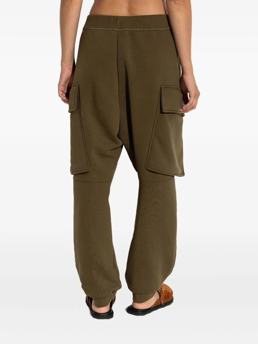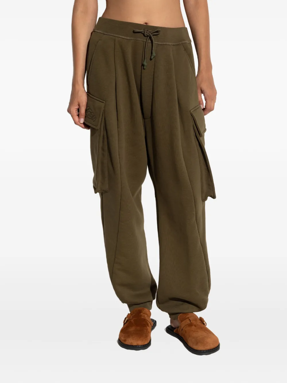 Оливково-зеленые плиссированные передние карманы-карго, затягивающиеся на шнурок, вышитый логотип на манжетах