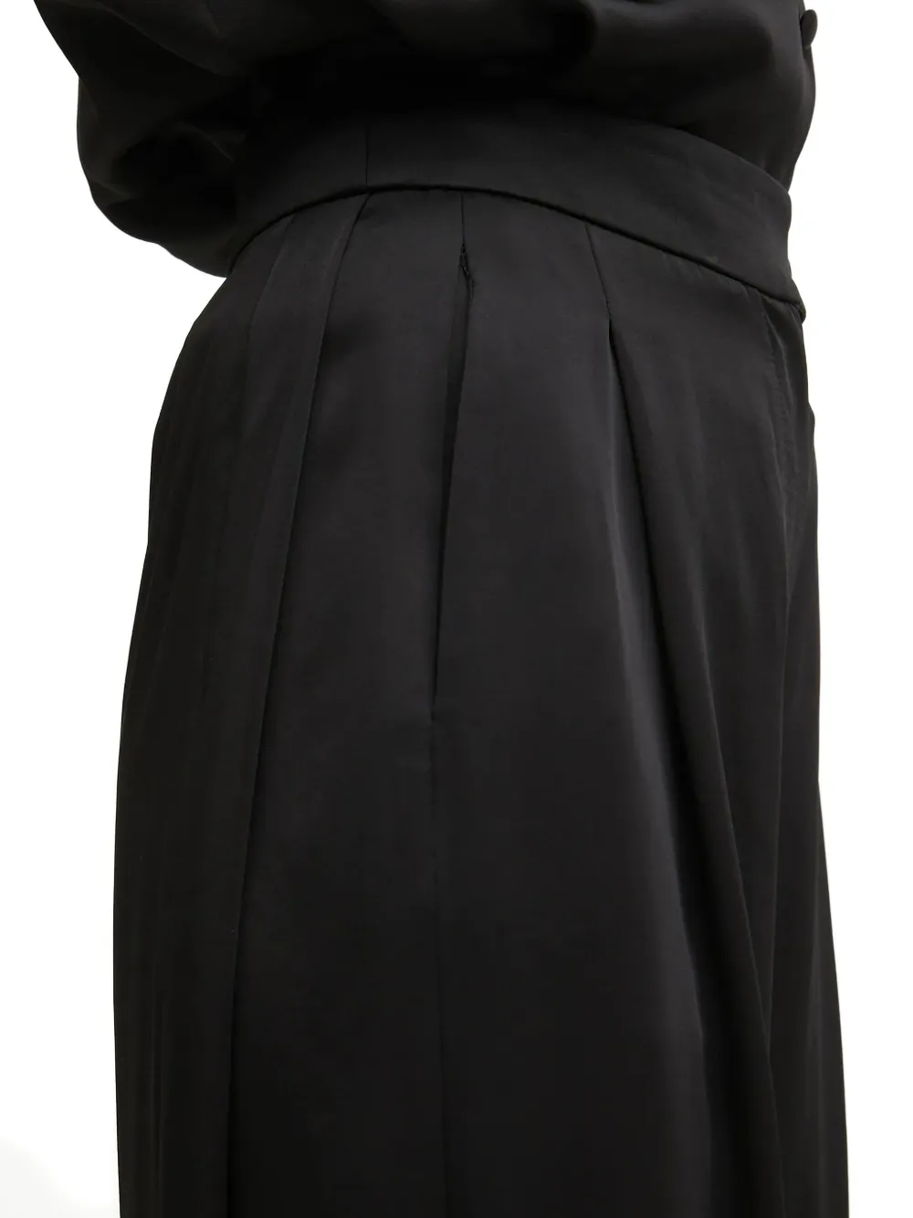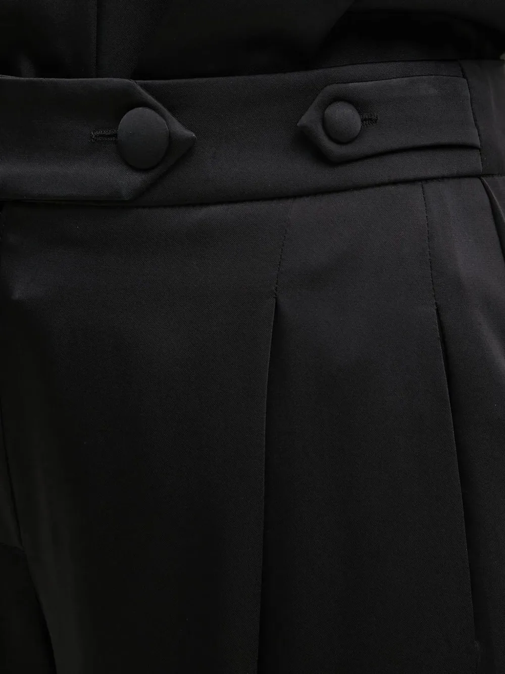 Черные складки спереди, застежка на пуговицы, прорезные карманы.