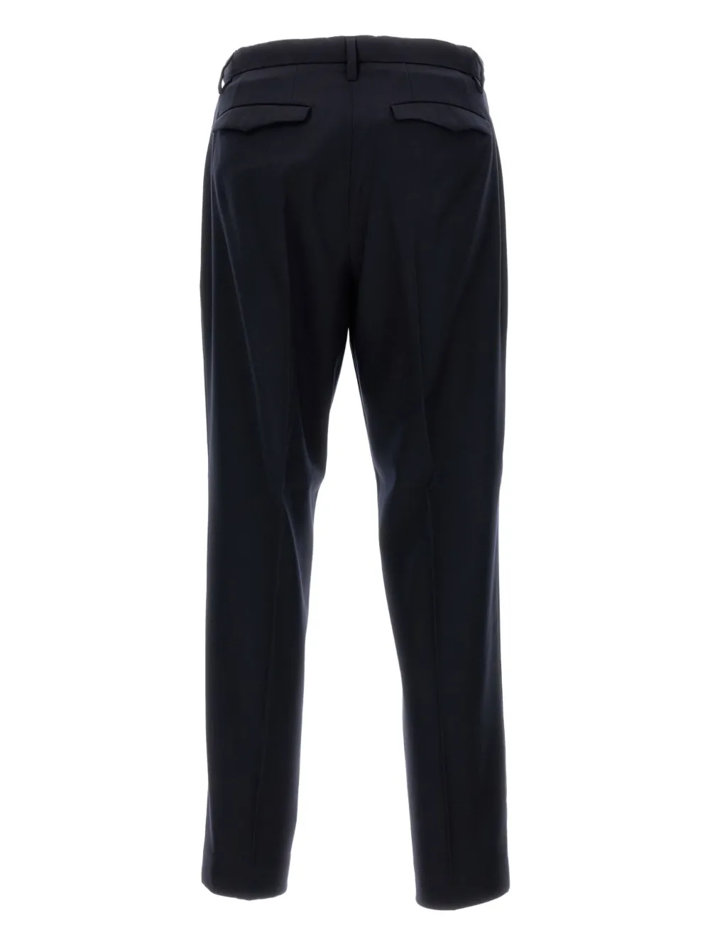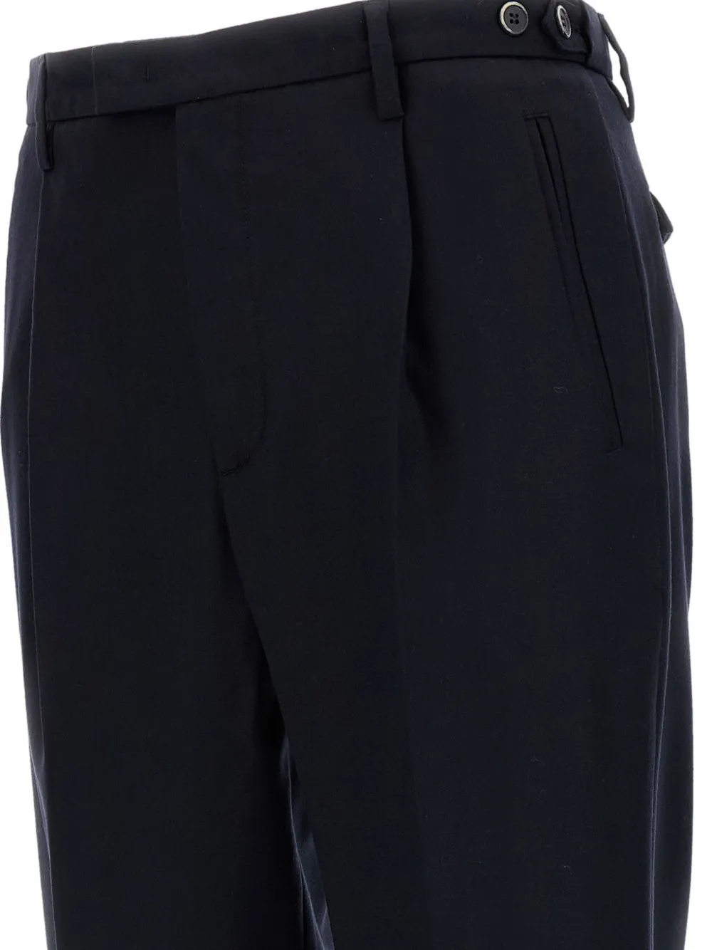 Темно-синяя шерстяная смесь, складки спереди, прорезные карманы по бокам, боковые регуляторы, шлевки для ремня