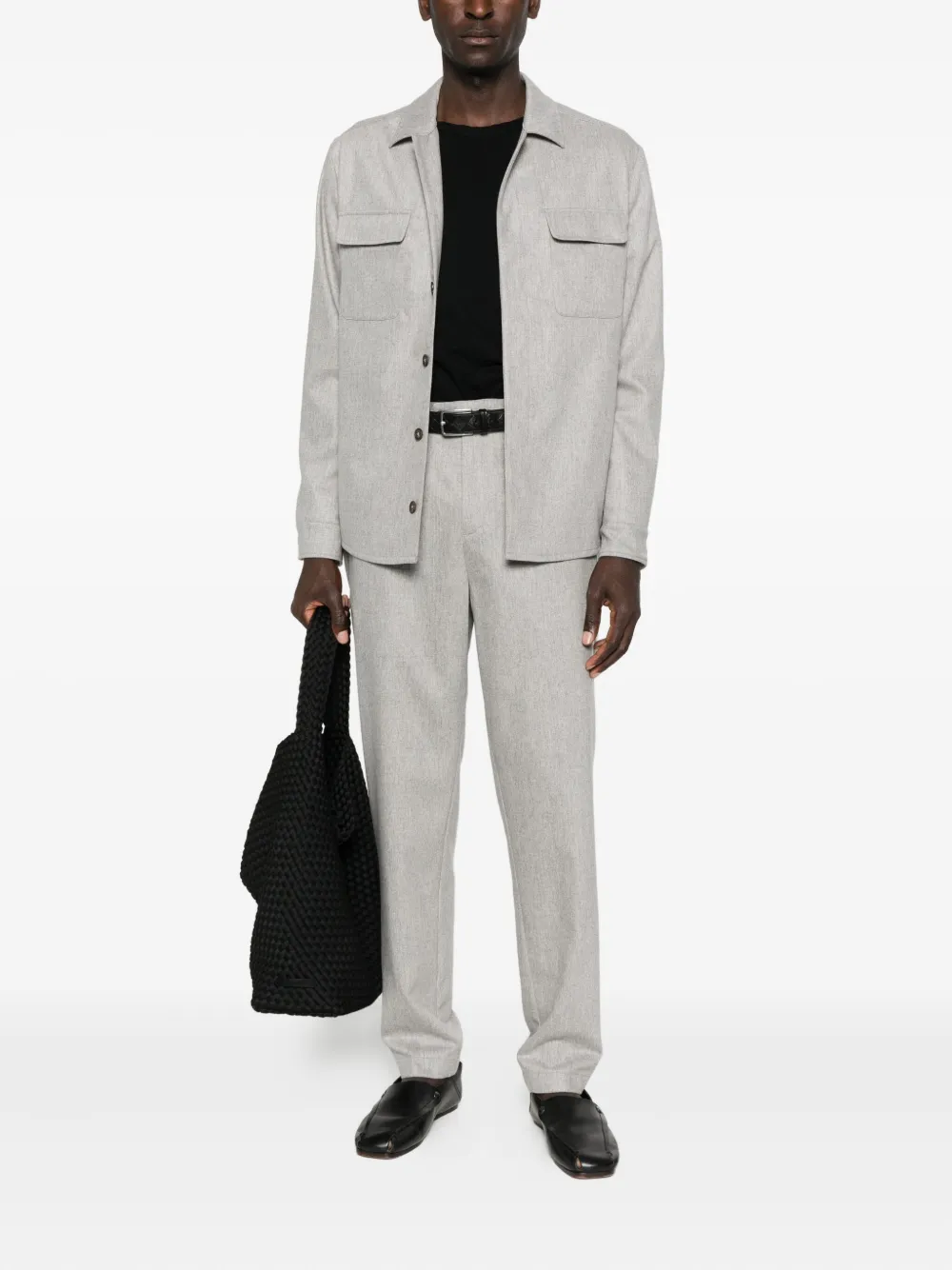 Серые складки спереди, застежка на пуговицы, боковые карманы