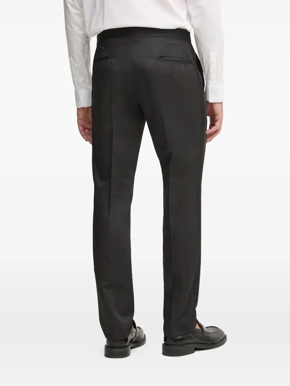 Черные плиссированные брюки спереди, прямой брючины, средняя посадка на талии, застежка на крючок и металлическую пряжку серебристого тона.
