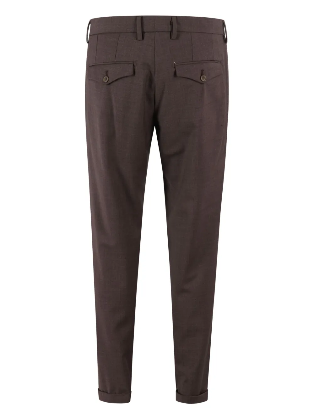 Коричневые передние складки, застежка на пуговицы, боковые карманы, шлевки для ремня.