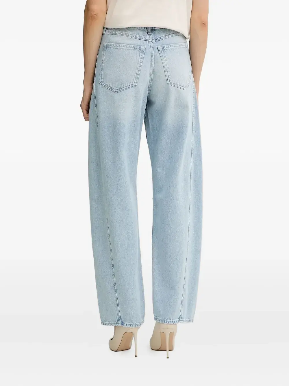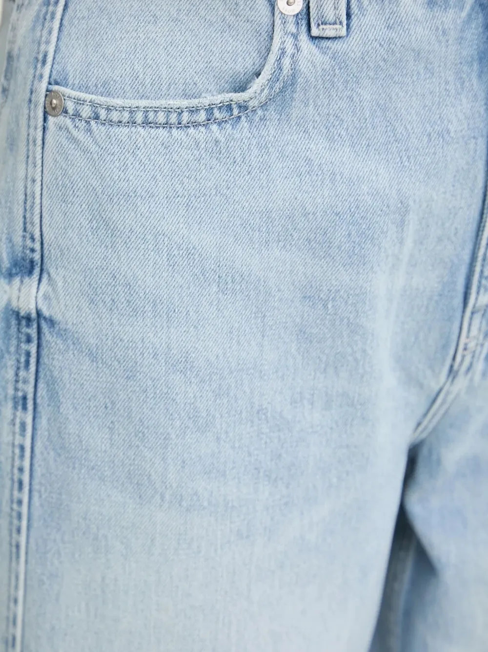 Светло-голубой прямой крой с пятью карманами и пуговицами.
