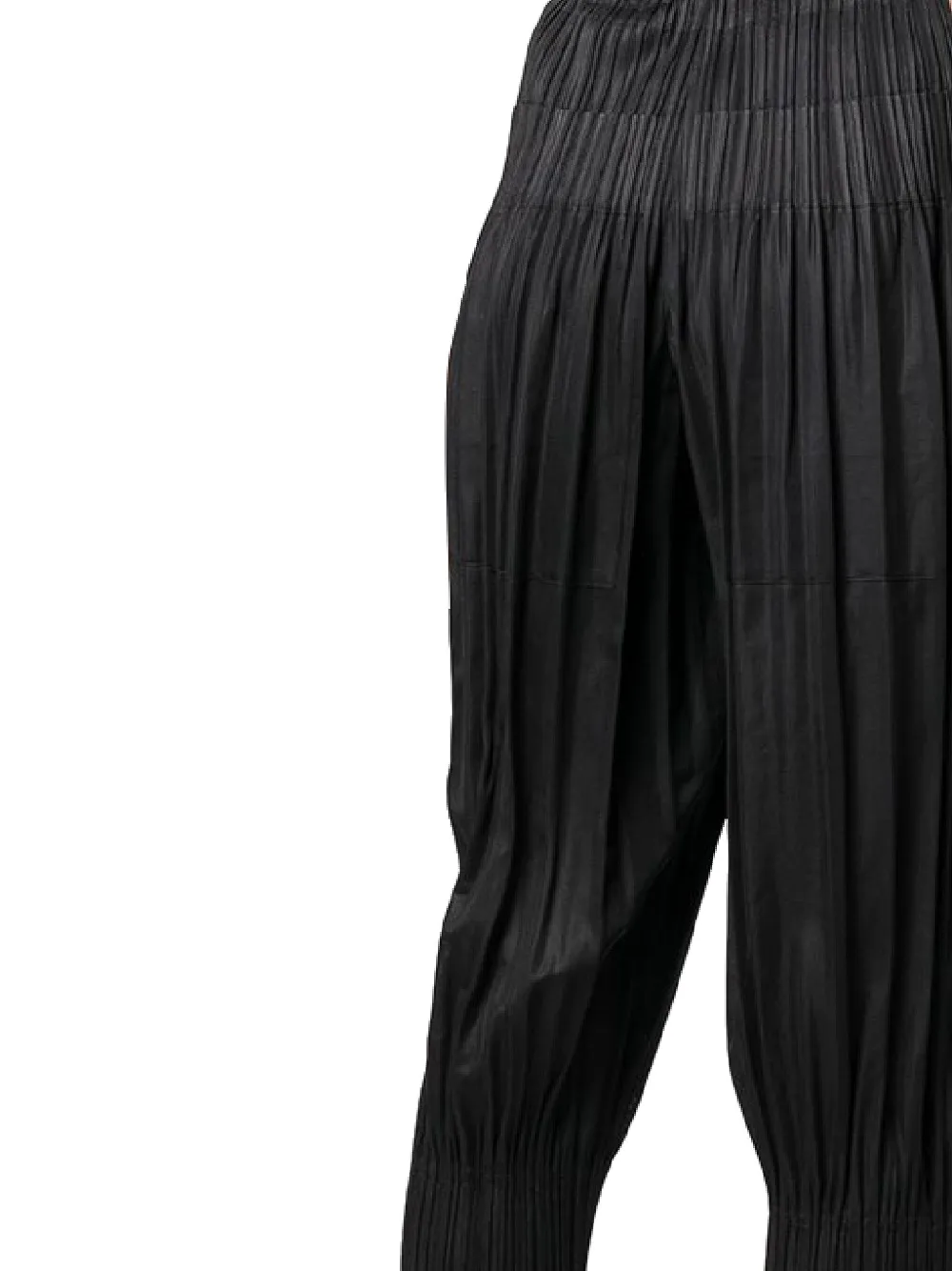 Черные плиссированные детали, панельный дизайн, эластичный пояс, укороченные штанины, манжеты на подгибе