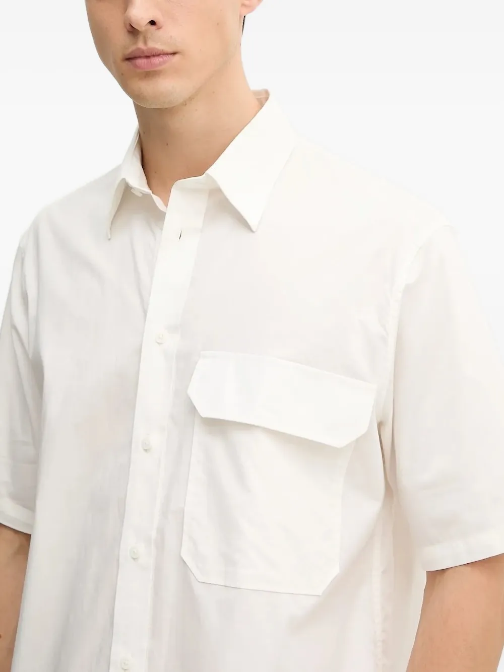 Белый хлопковый короткий рукав, застежка на пуговицы, нагрудный карман