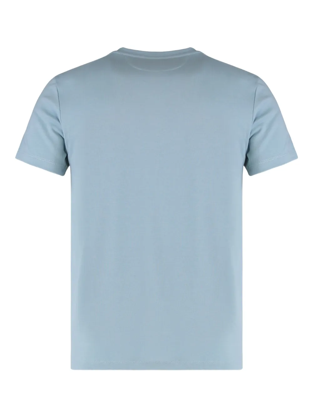 Светло-голубой, с короткими рукавами, круглым вырезом, нагрудным карманом, хлопок